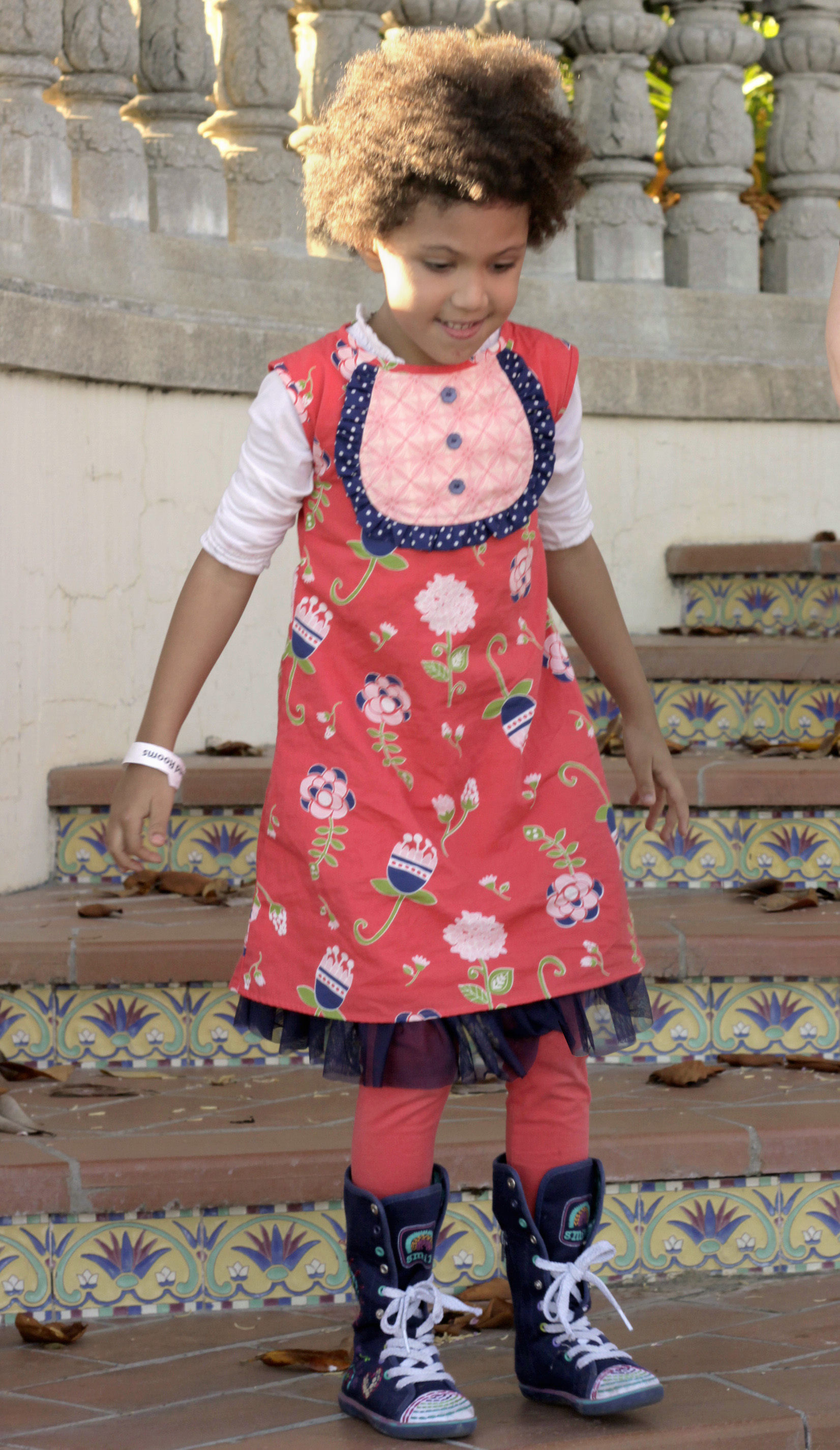 I love how these pieces, all from different brands, matched into one perfect set. Annabelle dress in red floral is from Gypsy Caravan collection by Persnickety. Exact same color leggings are from Zara. Under the dress Alice is wearing same Gap shrug as on 4/5/13. Boots are by Naartjie.
