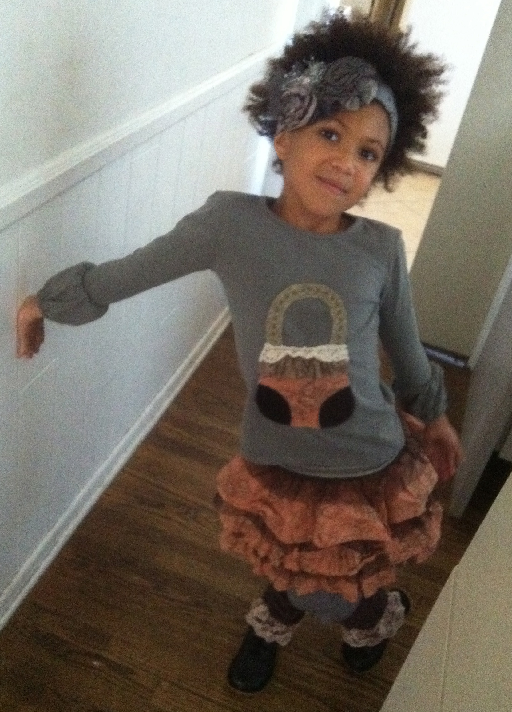 Trying on our Persnickety outfit for upcoming fall: Purse applique top, coral Suzie skirt, lace leg warmers, and Zaya gray rosette headband. PePe Prairie boots in Canyon Nero (dark gray).