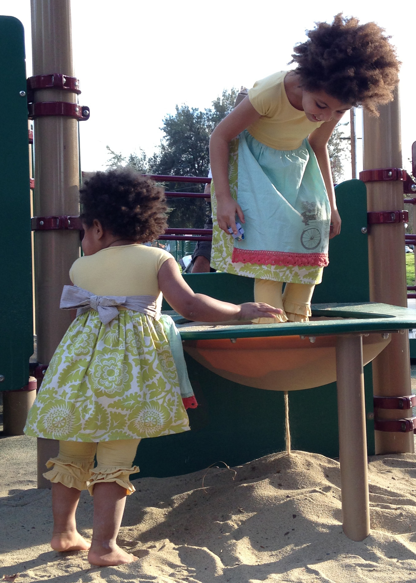 Same Persnickety Mya Bicycle dresses on both girls with the same Triple Ruffle Yellow leggings from Heirloom collection.