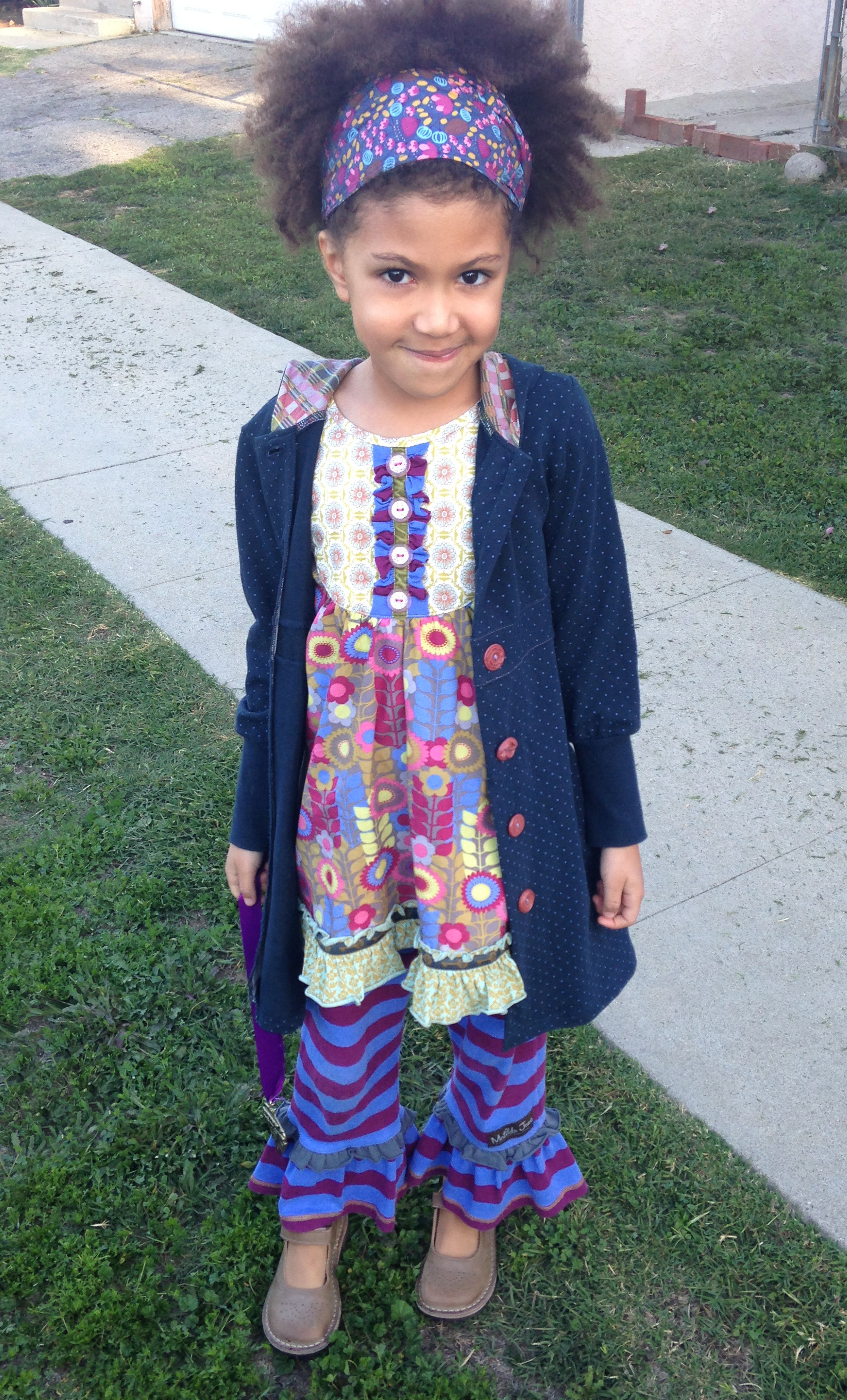Matilda Jane day! Alice is wearing MJ pieces mixed from different collections. Her Chasing Daisy flutter dress and Royal Big Ruffles are from Heart Soul Pride / Character Counts collection. The Splatter headband is from Paint by Numbers collection. Her True Blue Willow coat is from You & Me / Homeroom collection. PePe antique bronze Mary Janes.