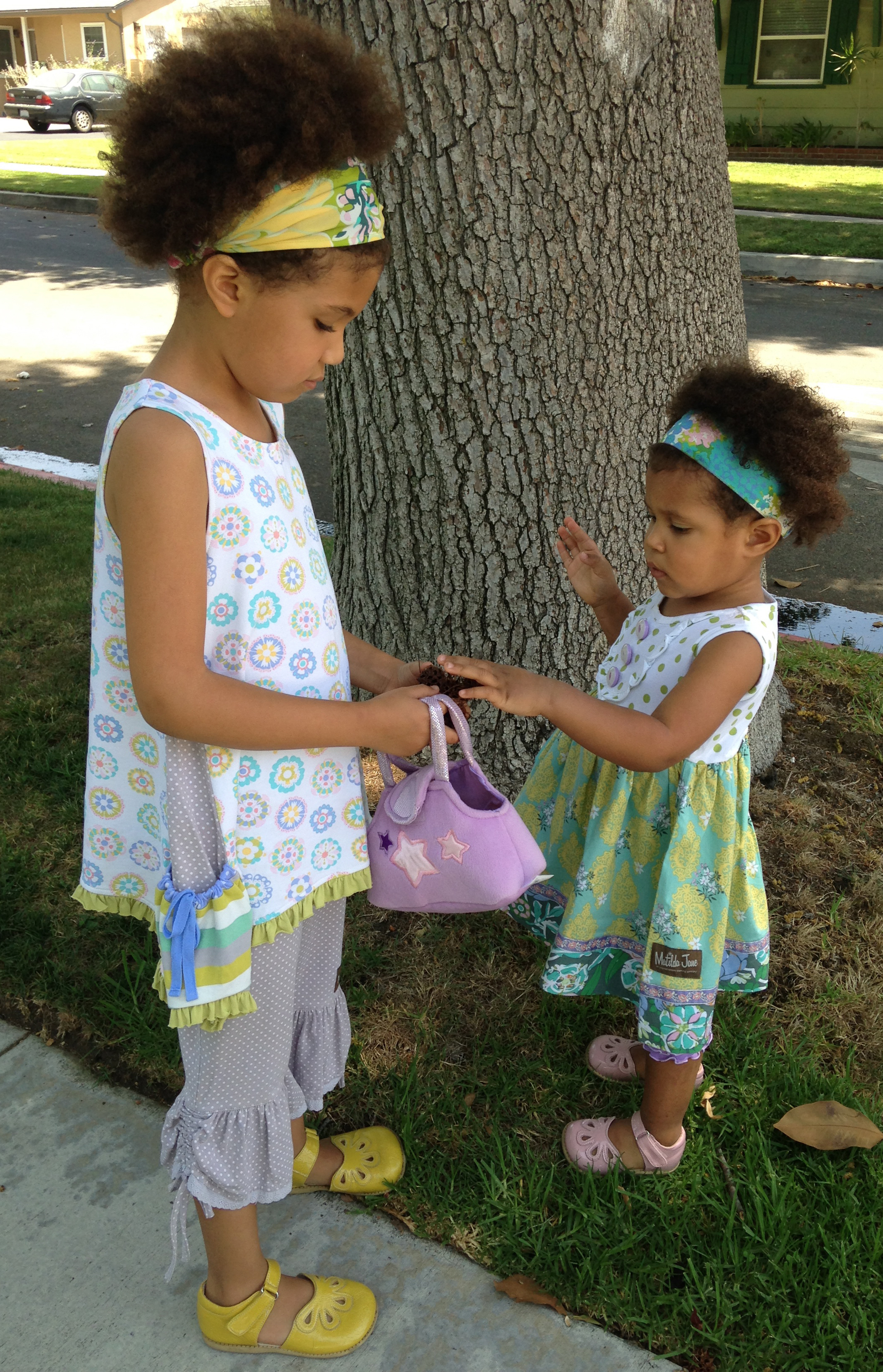 Alice is in the Pinwheel Trapeze top and Daydreamer Big Ruffles from It’s A Wonderful Parade collection by Matilda Jane. Alice’s headband and Ellie’s Chelsea dress are from an older MJ collection called House of Clouds. Ellie’s headband is called 1st Day of Spring by Matilda Jane Platinum. Livie and Luca pink Petals for Ellie, and yellow for Alice.