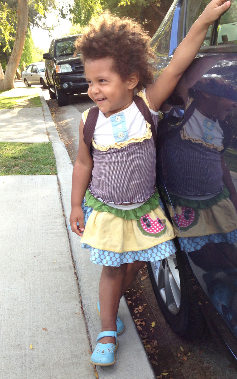 This Persnickety set is from their Spring 2011 collection. Watermelon Apron Bubble skirt in Slate polka dot and matching brown Lou Lou top. Sky Blue Petals from Livie and Luca match the blue of the skirt perfectly.