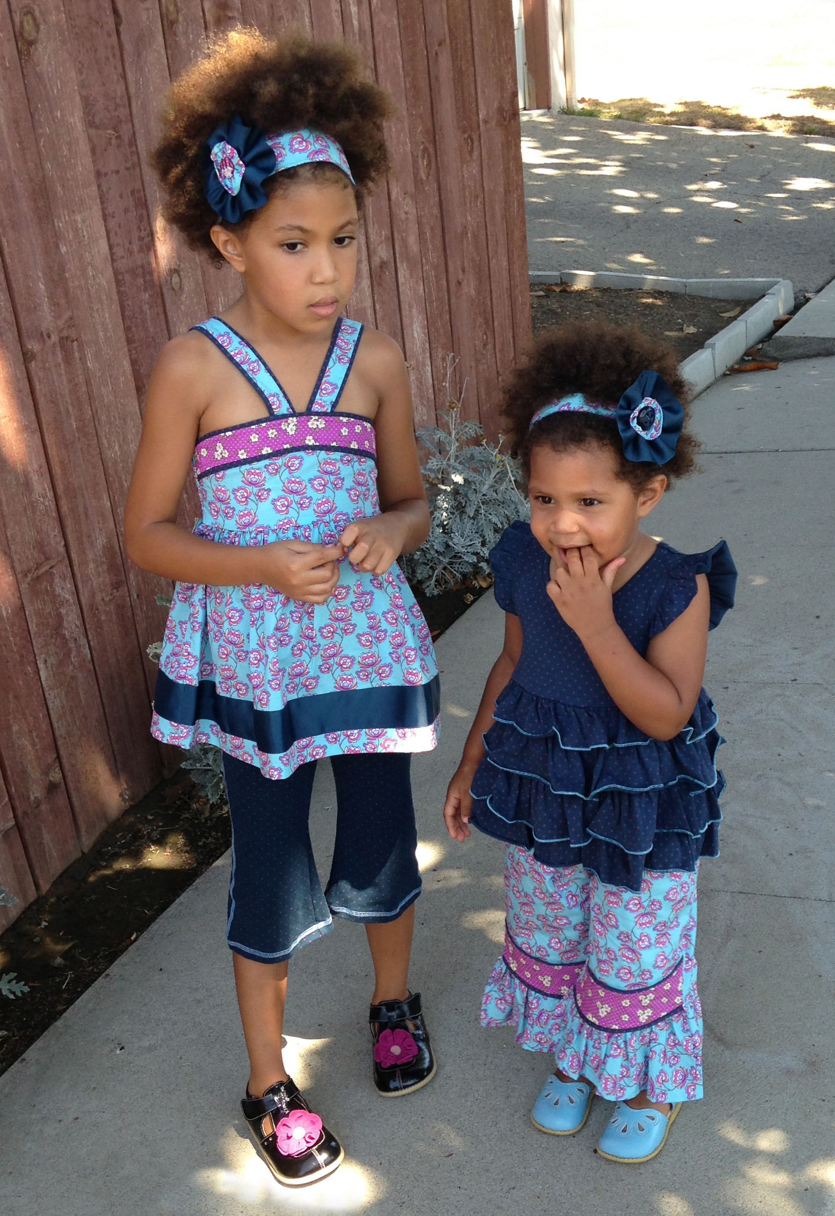 Girls are wearing Matilda Jane with a twist… I got this Pontoon top and Footloose Flared leggings for Alice and loved the colors so much that decided to get a matching outfit for Ellie from the same It’s A Wonderful Parade collection. I figured Navy Lizzy top with 4 layers of ruffles and fluter sleeves (that Ellie is wearing) would be perfect. The problem was in the bottoms – MJ didn’t make any pants or skirt that would match the Pontoon in this collection. I thought Cosmos Finns should be close enough, but when they arrived the dye had whole lot of fuchsia and almost no blue. So I had to fix it myself. I bought another Pontoon in size 14, disassembled it, got behind the sawing machine for an evening, and voila! Pontoon pants for Ellie, plus the headbands:) With their outfits girls are wearing Livie and Luca shoes, Alice – Navy Blossoms, and Ellie – Sky Blue Petals.