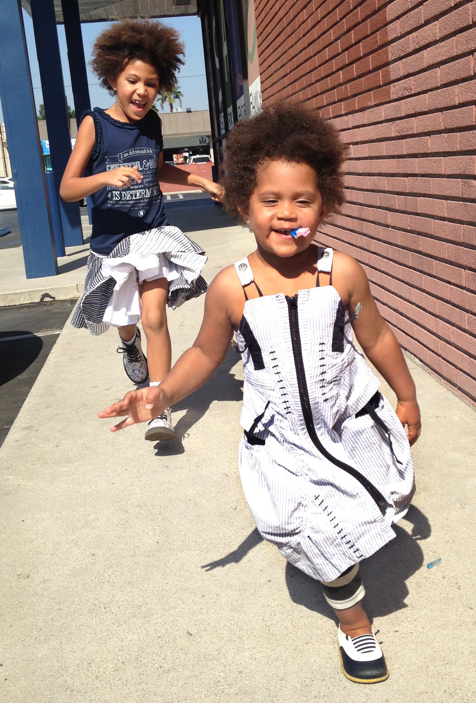We mixed Jottum with Persnickety in these matching sisters outfits. Alice is wearing Jottum striped skirt with Persnickety Basic Ruffle Tank in Blue, from Summer Celebration collection, that reads ‘I am determined to be cheerful and happy…’. Her boots are Delaney in Blue Little Flowers by Dr.Martens. Ellie’s suspender style dress/jumper in pin stripe zips up the front and is by Jottum. It’s worn over Persnickety Basic Leggings in Black stripe, which are from the new Fall 2014 Autumn Splendor collection. Her shoes are Livie and Luca Ports in blue.