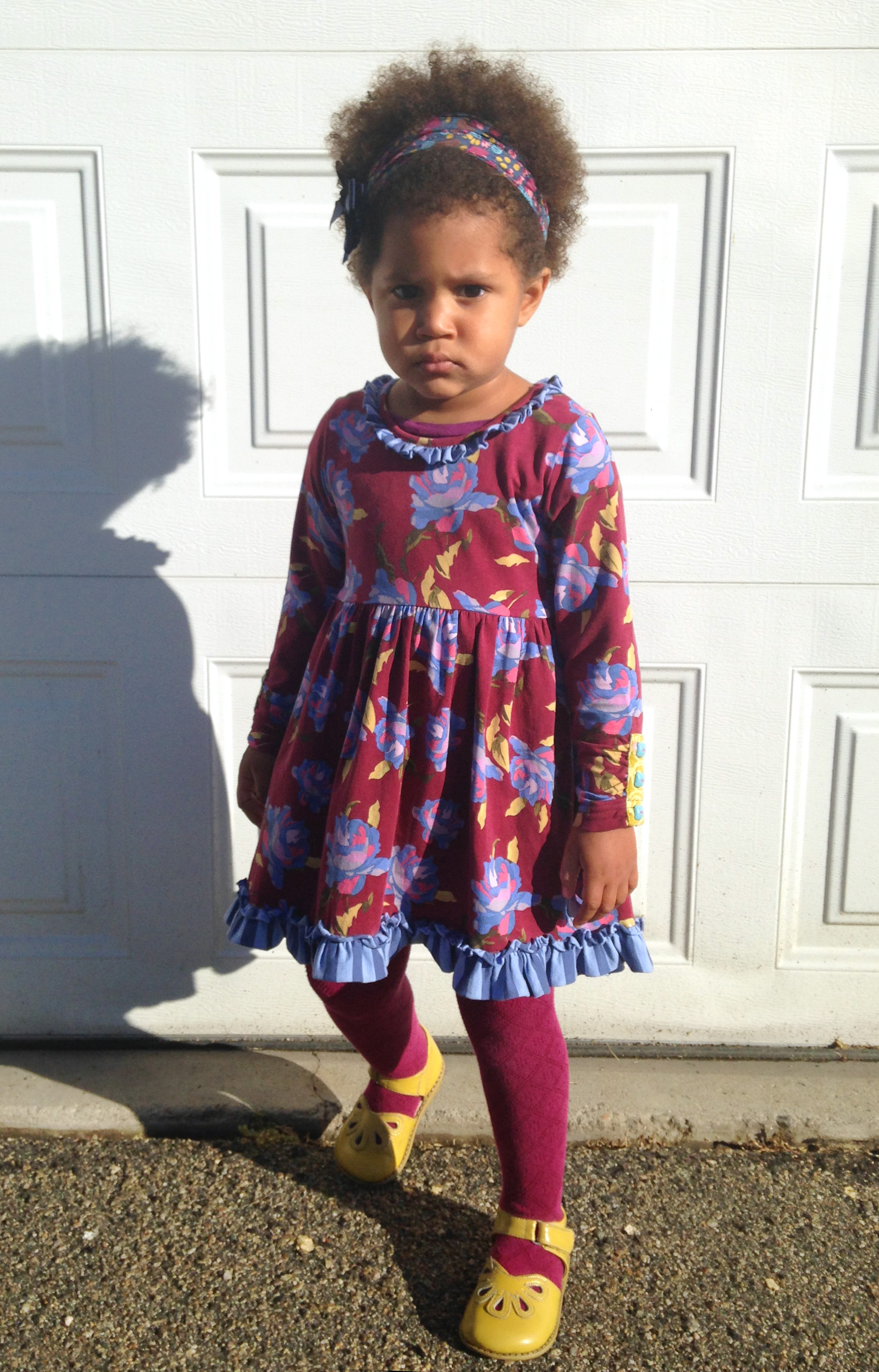 Today Ellie is dressed up in Winifred dress from Matilda Jane‘s Heart Soul Pride / Character Counts collection. Her Splatter headband is from Paint by Numbers collection, by Matilda Jane as well. Tights are from Naartjie. Shoes are Livie and Luca mustard yellow Petals.