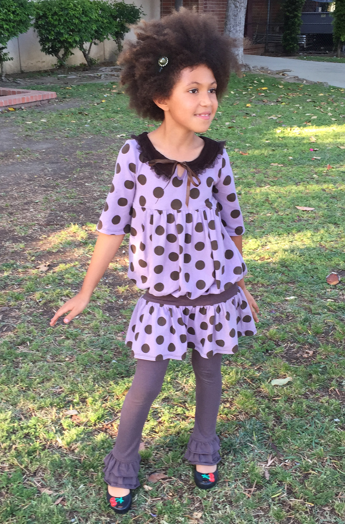 Alice feels pretty in this beautiful Persnickety set of Plum Annie dress in purple dot and Chocolate Triple Ruffle leggings. She loves her new Melissa Ultragirl X jelly shoes with cherries from Eat My Melissa collection. Aimee hair clip is by Joyfolie.