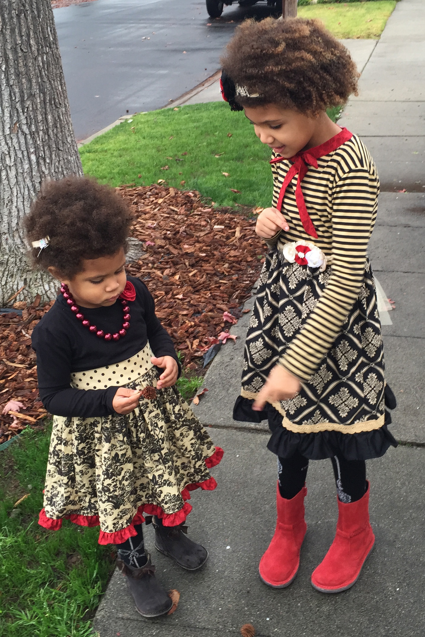 These Christmas outfits are both Persnickety, but the one on Ellie is from this year’s Holiday collection and the one Alice is wearing is from couple years back. Well, technically Alice’s Nellie dress with the bird applique is from Fall 2012 Jeweled Forest collection, but it looks pretty Christmassy… and just pretty. She’s wearing it with the matching basic leggings in pink stripe, and Cecilia headband in the same pink stripe. Cream Mesh Tee under the dress. Her red boots are Aster Mariana in Chili Bronx Suede. Ellie’s black and tan outfit is from Persnickety’s 2014 Holiday collection: Basic Holiday Applique tee with stockings and striped sleeves, and Coral skirt in tan. She’s wearing Brownie Pie headband, also by Persnickety, and Joyfolie Harlow shoes in brown with cream pleats and black bows.