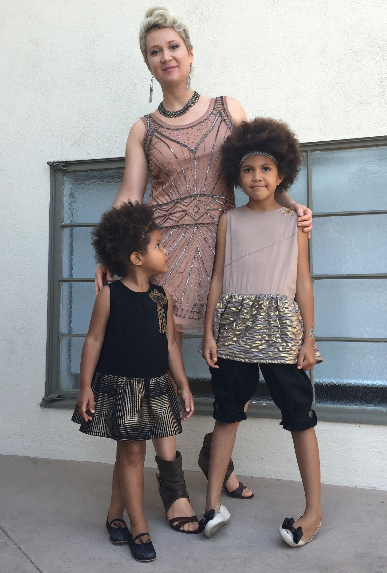 I delegated taking pictures to my son and got into the shot. He did great, just Alice wouldn’t stop making faces :)) The girls are wearing Blu Pony Vintage Selma L. Party dresses, in black and gold – on Ellie and fawn and gold – on Alice. Alice is borrowing Ellie’s dress in smaller size, so it looks like a top on her. She’s wearing it with Persnickety Black Knickers from Holiday collection. Ellie’s shoes are Bloch Glitz black sparkly ballet flats, and Alice is wearing jelly flats with large bows and peep toes called Ultragirl Sweet IX by Melissa.