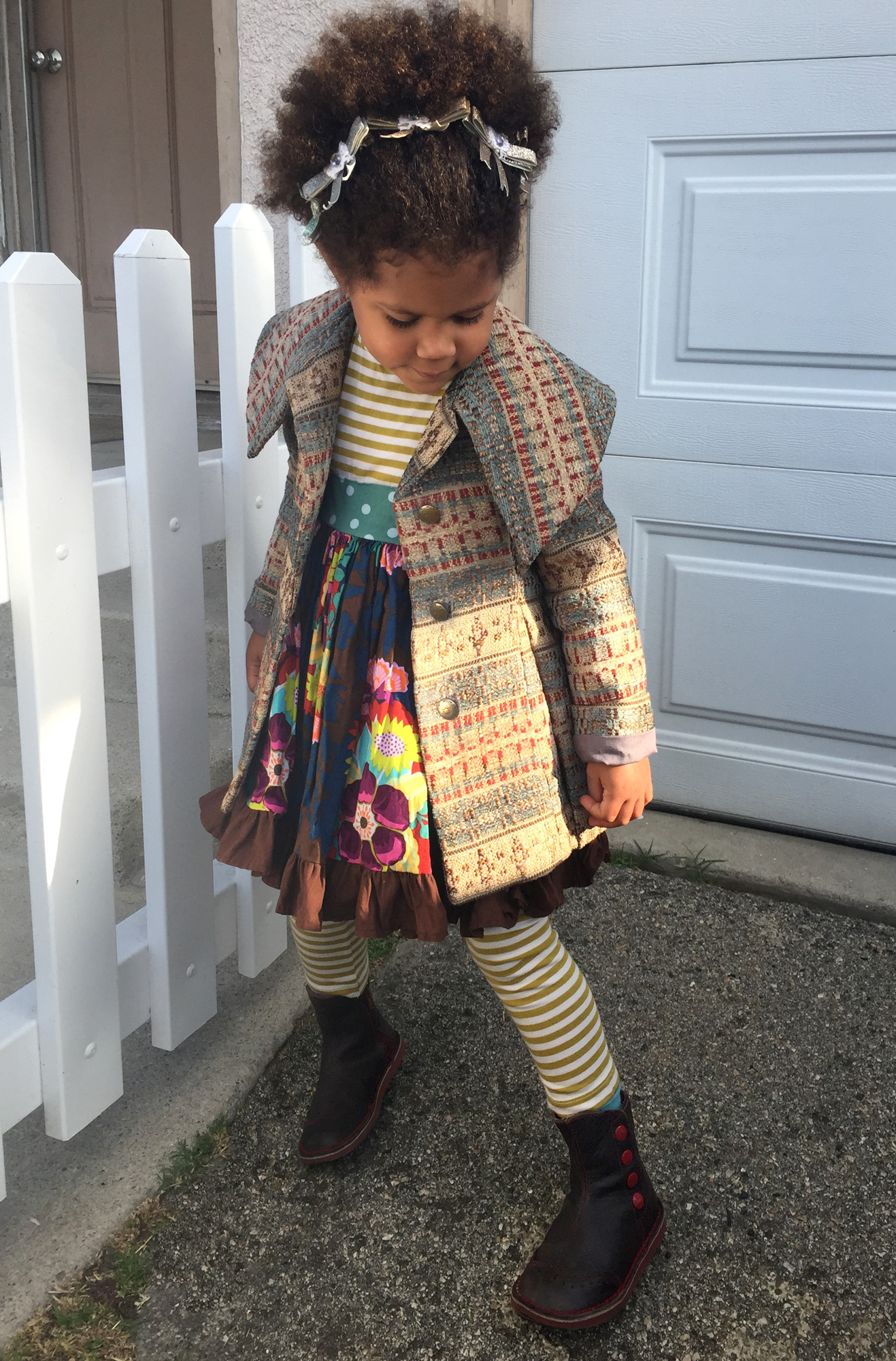 Ellie is wearing Jak & Peppar Follow Your Heart tunic over Blu Pony Vintage Clara B. slip, and Persnickety Triple Ruffle Cranberry leggings. Her perforated shoes are Spectator Mary Janes by PePe. Alice’s Nellie dress with the bird applique is from Jeweled Forest collection by Persnickety. She’s wearing it over Persnickety Boots Applique puffer top and the same Cranberry leggings that Ellie is wearing. Her boots are Oilily Flower Power.