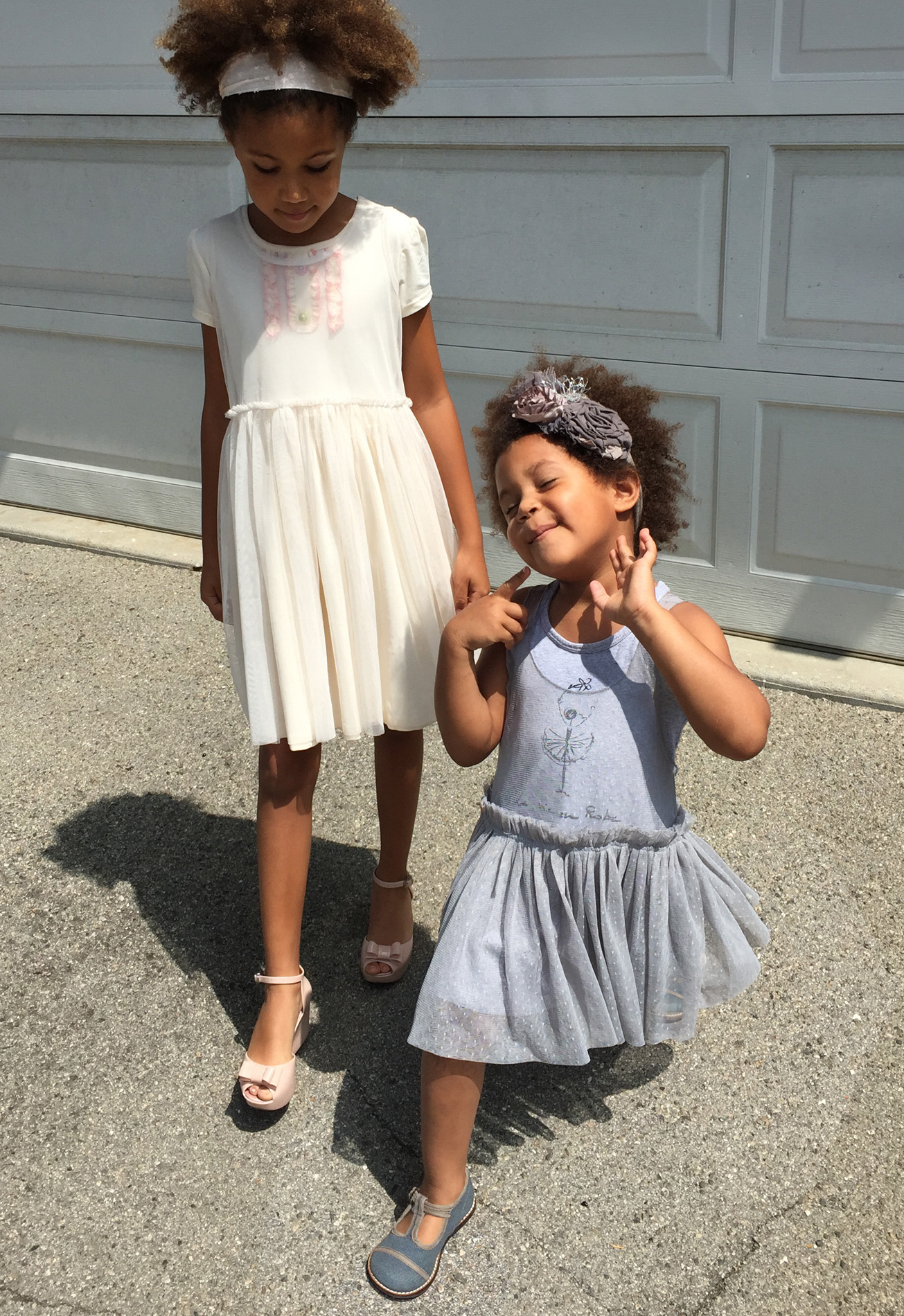 The idea of tulle overlay dresses is fabulous! They are so versatile: wear only the simple under dress to a beach or a playground, or add the mesh overlay to make it really dressy. And I think it will look super cool if worn over some jeans and T-shirt. Ellie’s grey Hibou dress by Eliane et Lena was designed like that, 2 in 1 – simple A-line tank knit underdress with beautiful, full, and twirly tulle layer over it. Love the ballerina design on the front peeking through the mesh! Alice is wearing Matilda Jane Cake Batter Lap Dress (Hello Lovely collection) under the detachable mesh layer of Special Snowflake Dress from 2014 Holiday collection. Headbands and shoes: Matilda Jane Popcorn headband and Melissa for Vivienne Westwood Anglomania wedge platforms – on Alice, Persnickety Zaya Gray Rosette headband and Bonpoint Philo T-bar canvas sandals – on Ellie.