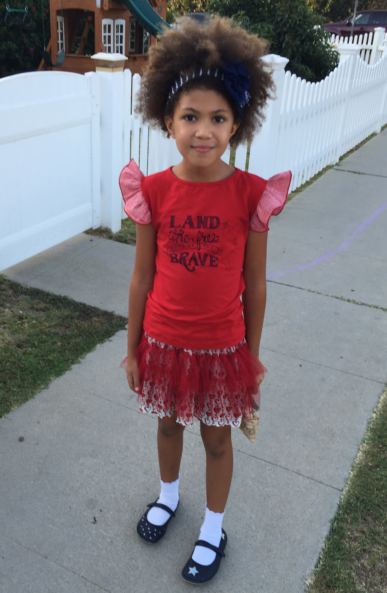 Persnickety Red Kate top from Summer Celebration collection paired with Paper Wings Tattoo Hearts Tutu skirt. Navy Camper Star Ballet Flats and Persnickety Blue Bell headband match the color of the tee design that reads: Land of the Free, Home of the Brave.