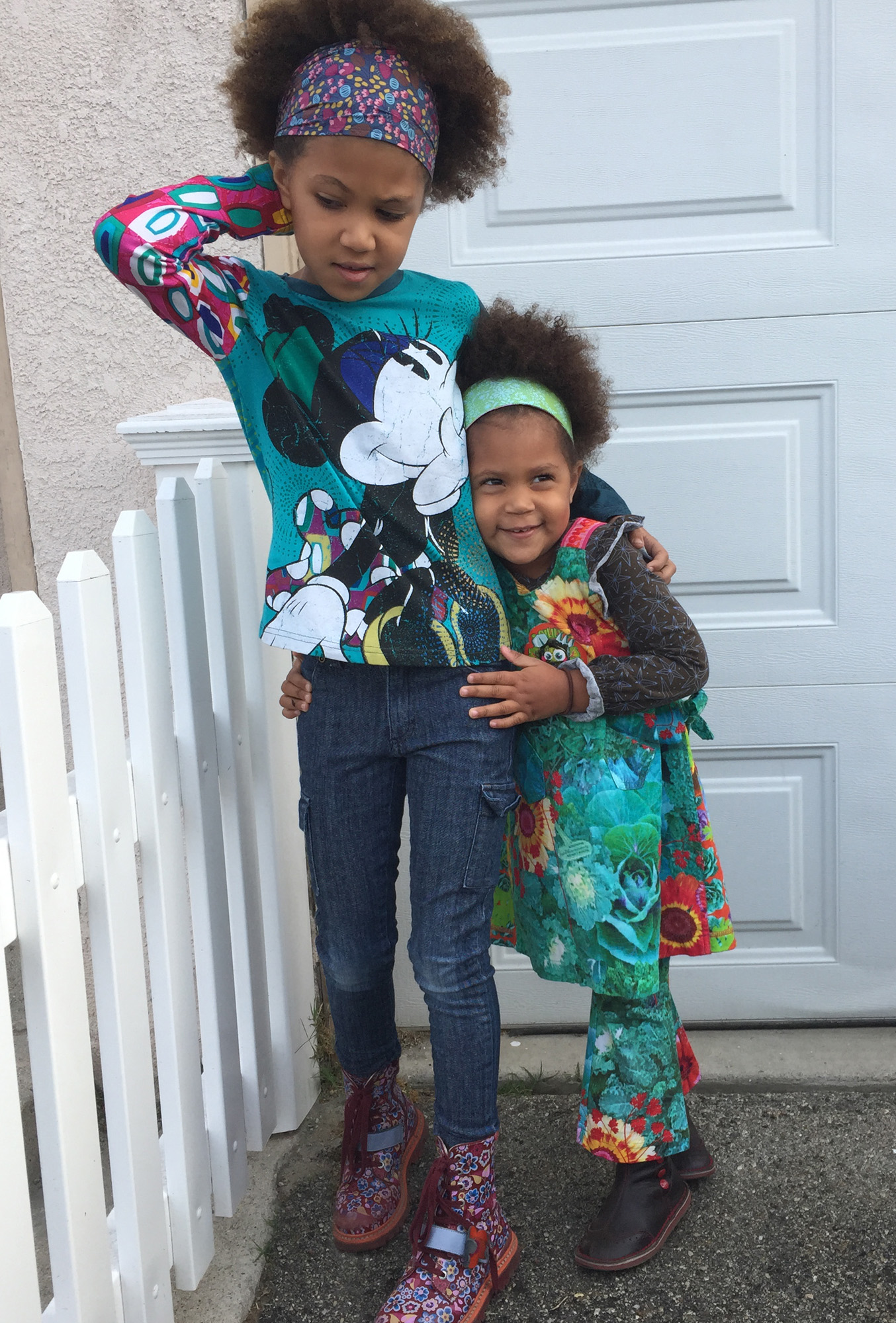 Desigual Azu Minnie Mouse Top with Persnickety Denim Skinny Jeans and Oilily Flower Power boots – that’s what Alice is wearing. Ellie’s set of Veggies jumper dress and pants is by Oilily, worn over Matilda Jane Mahogany Tee. Her boots are Camper Beetles. Headbands are by Matilda Jane.