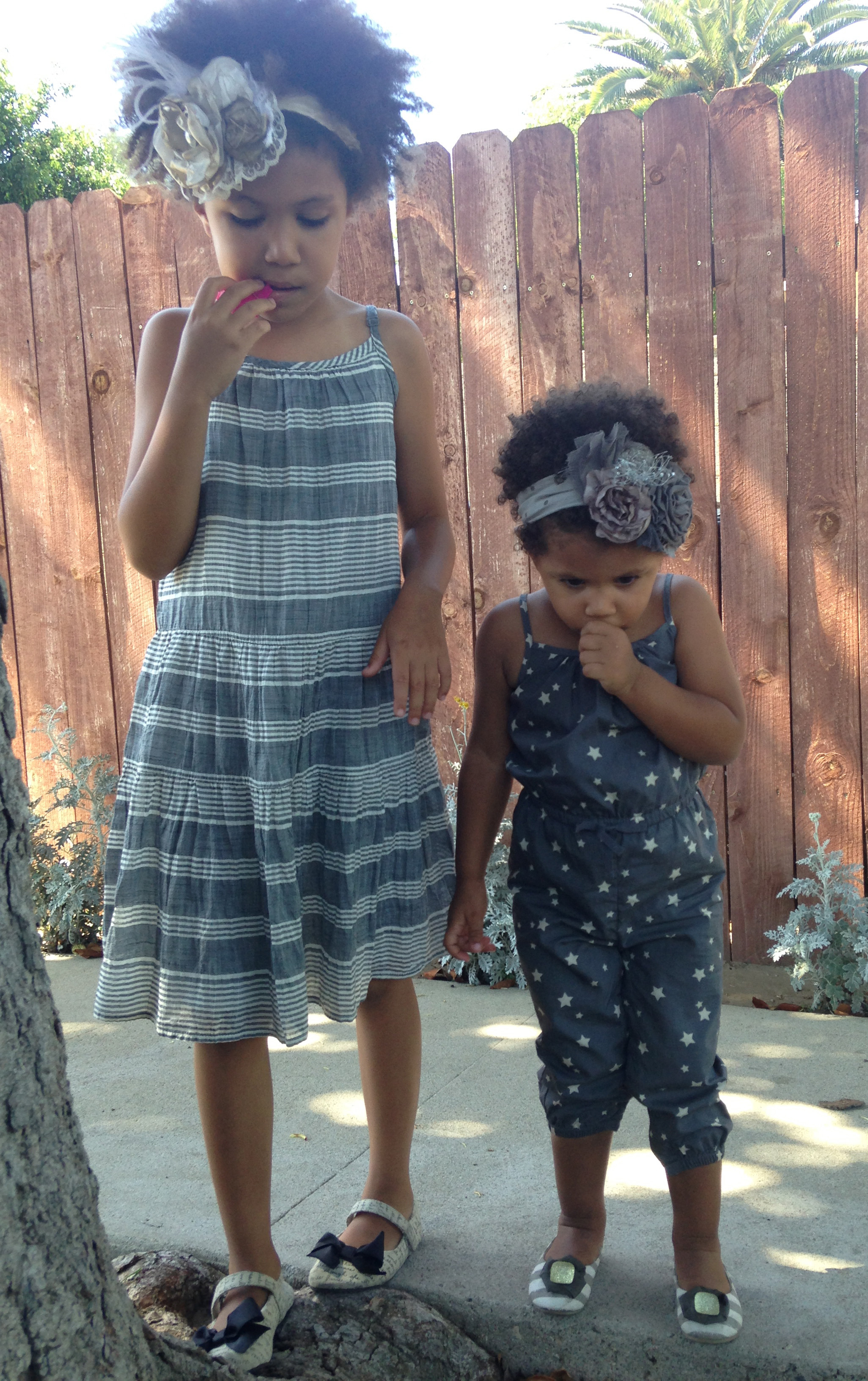 Lace, crochet, and embroidery. So very girly. Dollcake Oh So Girly dress/tunic on Alice (with pink crochet trim so big that it looks like a skirt!) seems to be a great match for Ellie’s Persnickety Lucille Dress from Nob Hill collection. With their dresses the girls are wearing basic cream leggings, Alice’s are from Gap, and Ellie’s are by Persnickety. Swiss dot headband in powder pink with long ties on the back is by Matilda Jane and called Popcorn. Alice is wearing simple flower clip by Persnickety in her hair, but it’s on the other side of the hair and didn’t get in the shot. Her shoes are Pink Petals by Livie and Luca, and Ellie’s cute pom-pom pink ballet shoes are from Gymboree store.