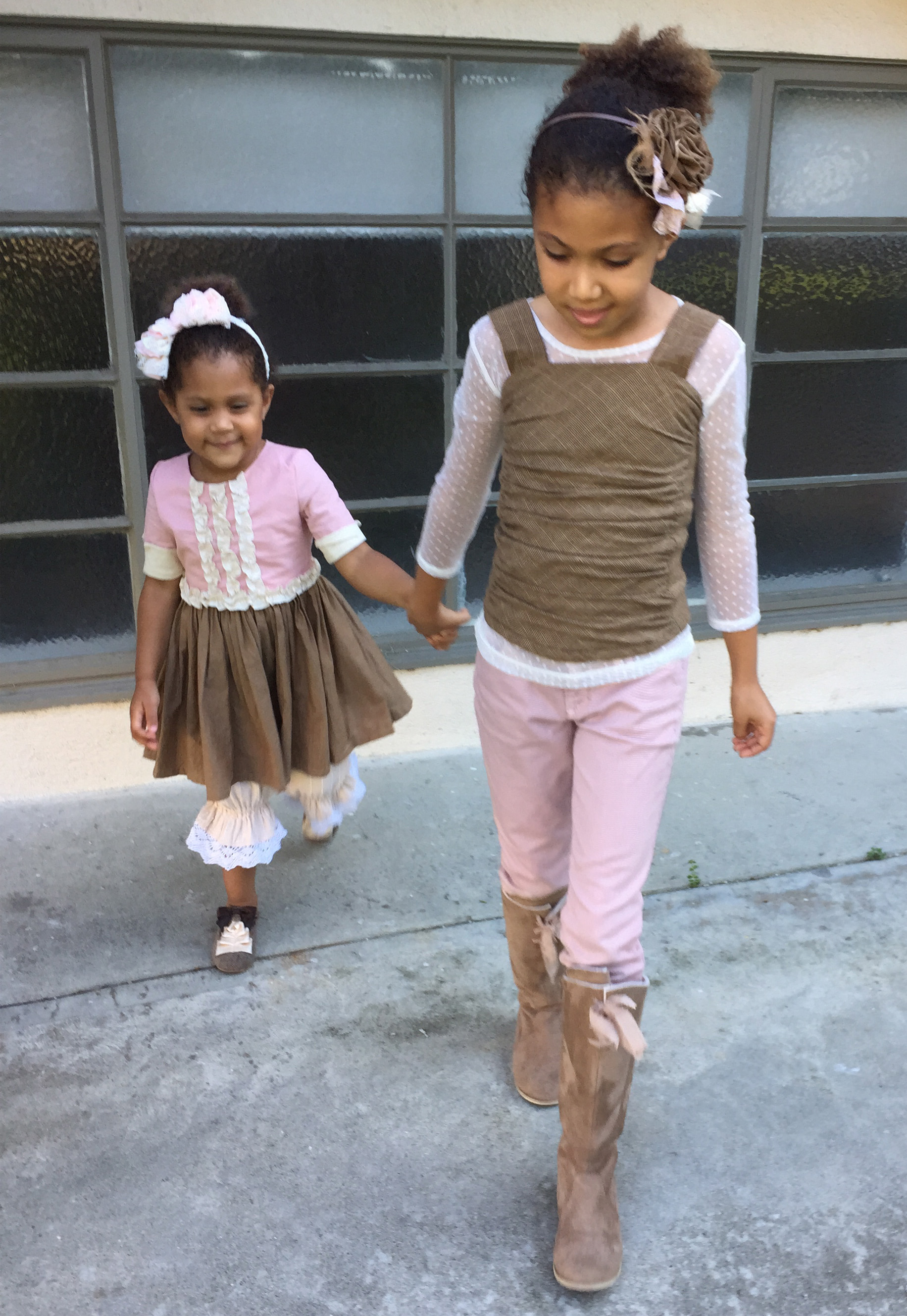 I found pieces for Alice’s outfit in our closet to match Ellie’s Catherine dress from Pretty in Pink collection by Persnickety. Her pink skinny jeans are from Gap, Basic Mesh tee, Brown Corset top, and Brownie Pie headband are by Persnickety, and the boots are Joyfolie Lacey boots in tan. Ellie is wearing her dress with Cream Bloomers from Apple Blossom collection. Savannah headband and Joyfolie Harlow shoes are finishing her outfit.