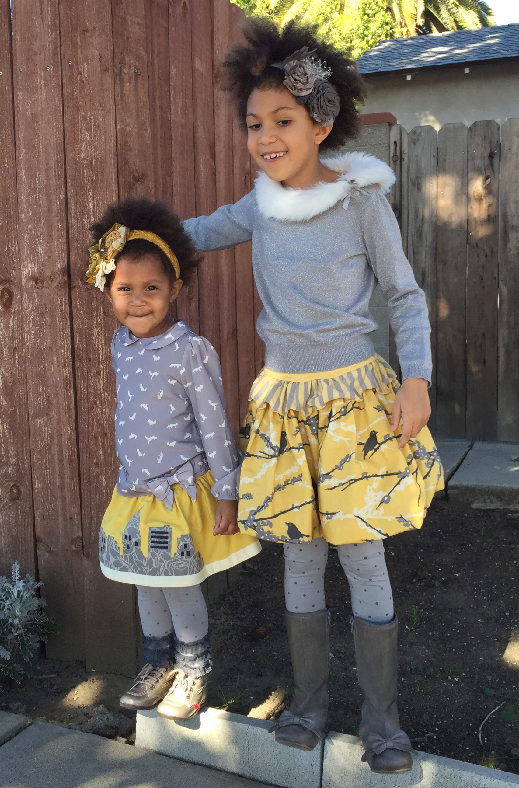 Janie and Jack tops, Persnickety bottoms. Ellie’s Fox Print Grey Top and Alice’s Faux Fur Collar Sparkle Sweater are from Festive Fox collection by Janie and Jack. Ellie’s Persnickety Brook Skirt in yellow with the city skyline applique is from October Sky collection. Alice’s Gold Bubble skirt with birds on branches print is from Persnickety’s Spring 2012 collection. Both girls are wearing the same Persnickety Grey Dot leggings. Both headbands are by Persnickety as well. The yellow one on Ellie is Goldielocks headband, and Alice’s is called Zaya Gray Rosette headband. Boots are: Kickers Billy4 on Ellie, and Joyfolie Maci in Gray on Alice.