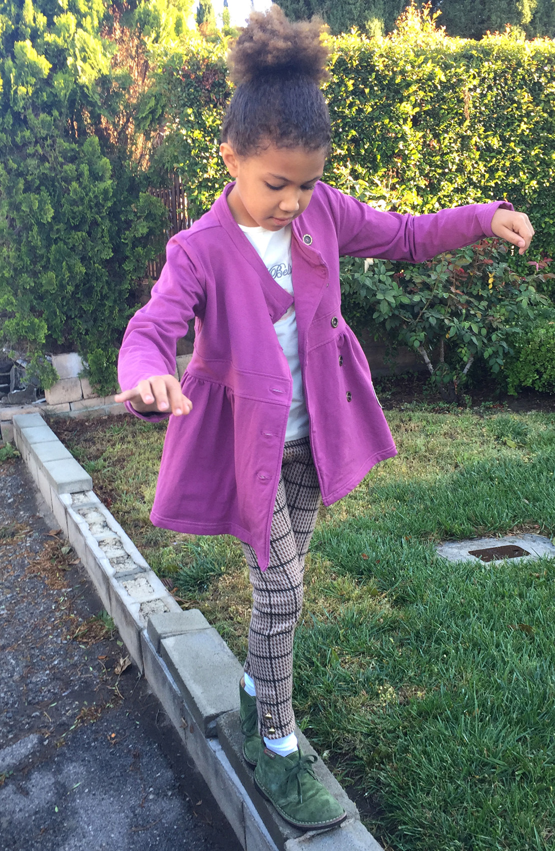 Matilda Jane purple Amethist Willow Jacket from Secret Fields collection, worn over Persnickety I Believe in Pink top from Pretty in Pink collection, and with Janie and Jack Plaid Ponte pants from English Rider collection. Naturino short suede boots.