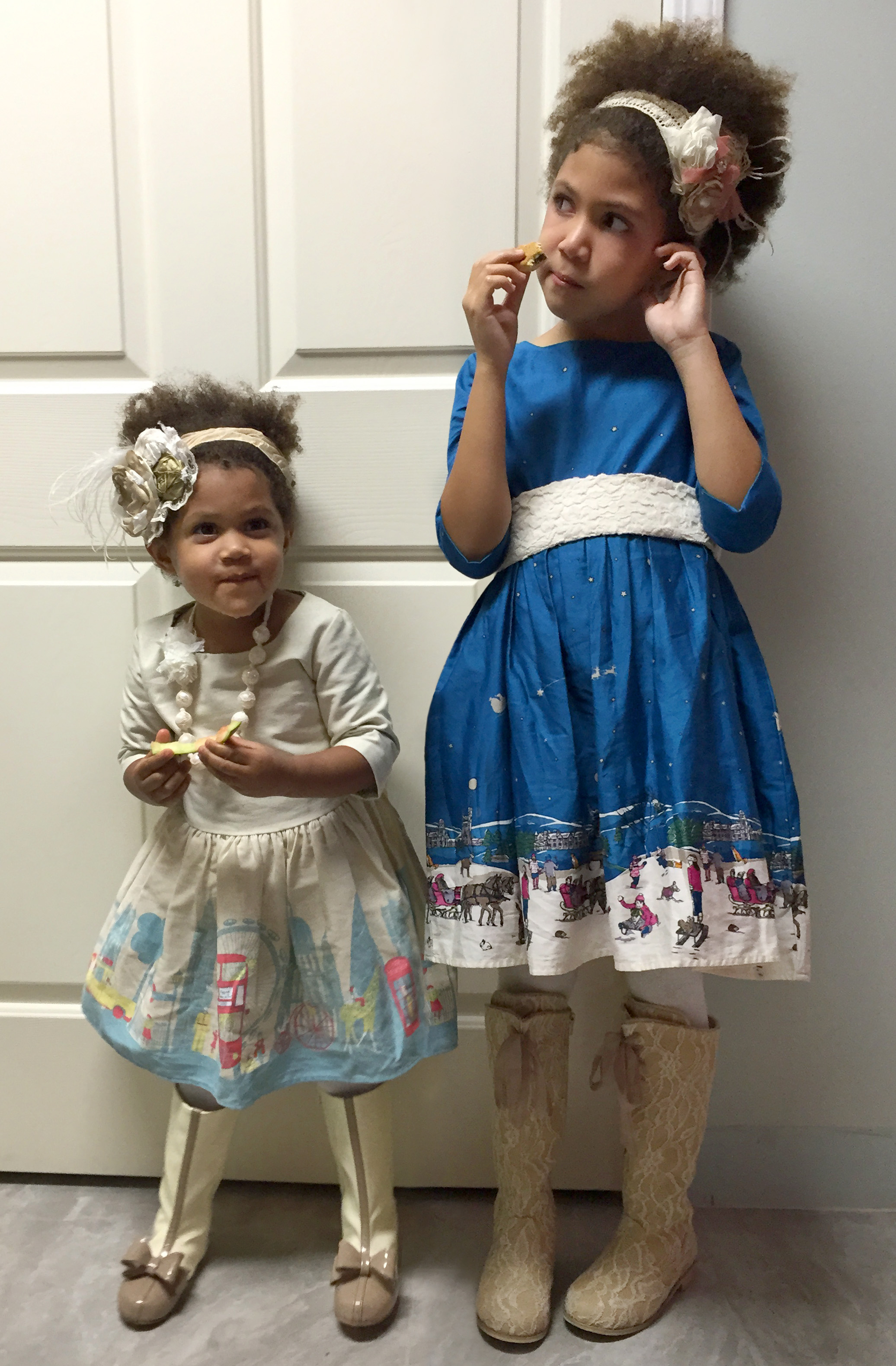 I think it’s becoming a tradition – for the Christmas party the girls are wearing storytelling border print dresses. Ellie’s Betty dress in London print is by Poppy of England. She’s wearing it with Joyfolie Elery boots in Latte color, and accessorized with Persnickety Lace necklace and Zaya-Ann headband. Alice’s Phoebe Winter Wonderland dress in Balmoral Border print is by Joules. Her boots are Lacey in Rose by Joyfolie, and she’s accessorized with Persnickety Lace sash and Creamsicle headband.