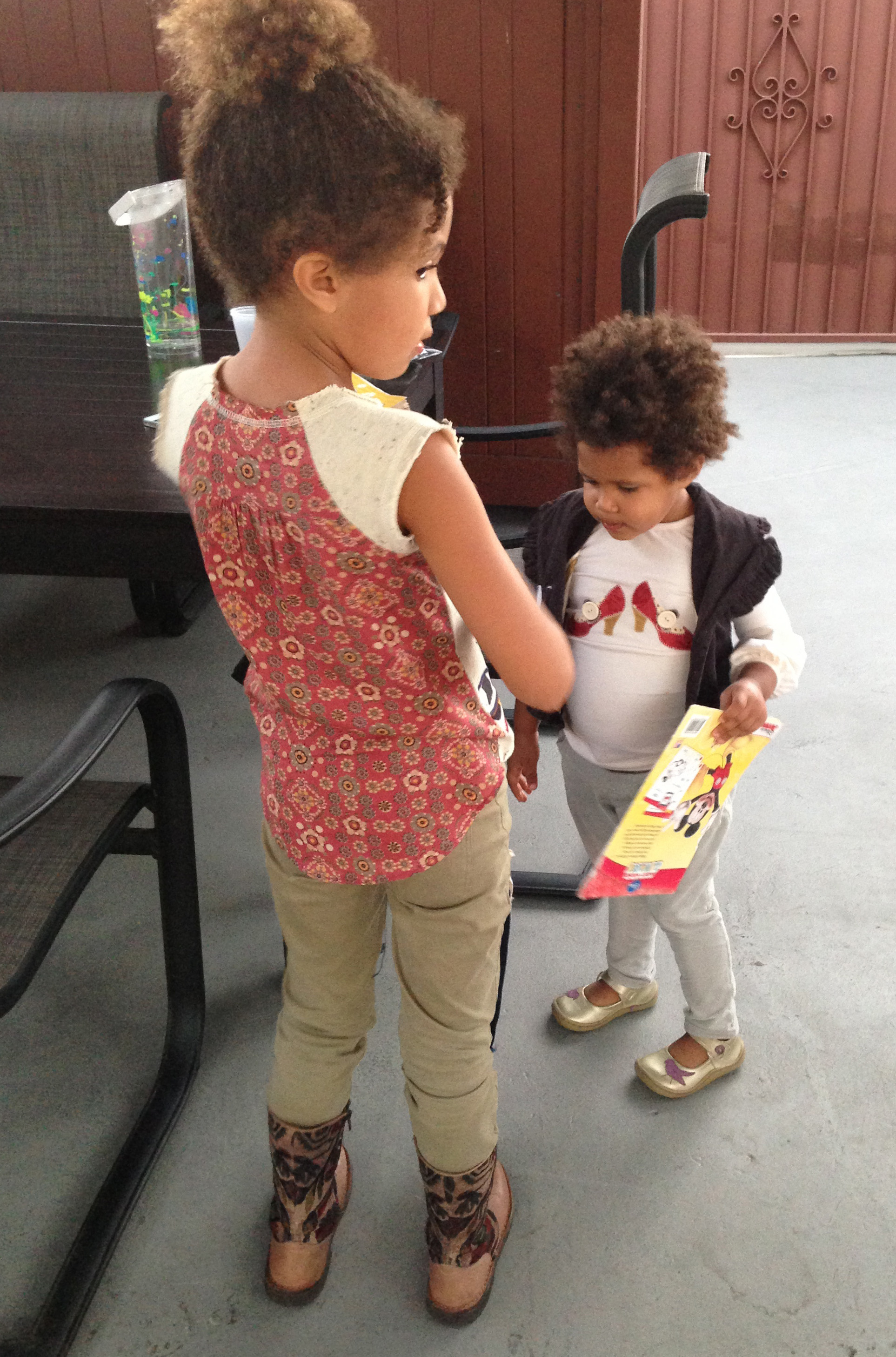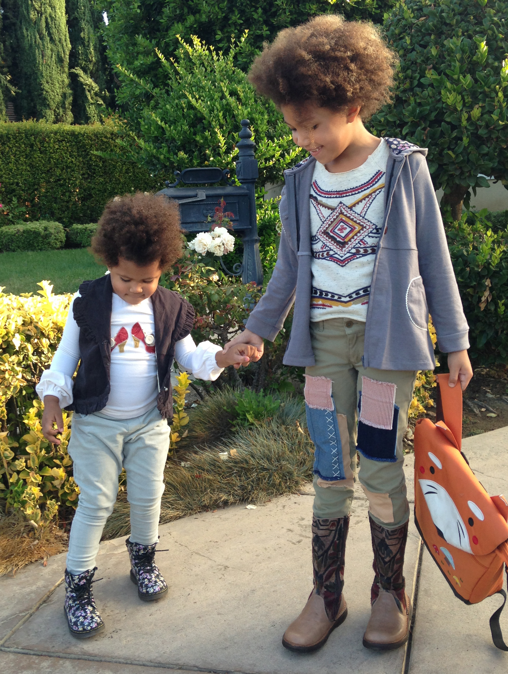 Today girls are wearing ‘unmixed’ outfits, same brand each. Ellie is dressed in all Persnickety: Grey Baby Cord Riding pants (Vintage Woodland) and Shoes Applique Puffer Sleeve top under the Grey Alice vest. Alice is wearing all Jak & Peppar: Pep School Cargo Patch Forrest Skinnies with Heartfelt Hoodie over Joplin High Low Tunic, both in Charcoal Motif. I love the back of that top! In the morning Ellie had Dr. Martens Brooklee boots in Black Mini Tydee. Then she changed into Livie and Luca gold Pio Pio shoes. Alice was wearing Brocade Maisole PePe boots in Taupe all day. The Fox backpack from The Land of Nod is called Teacher’s Pet.