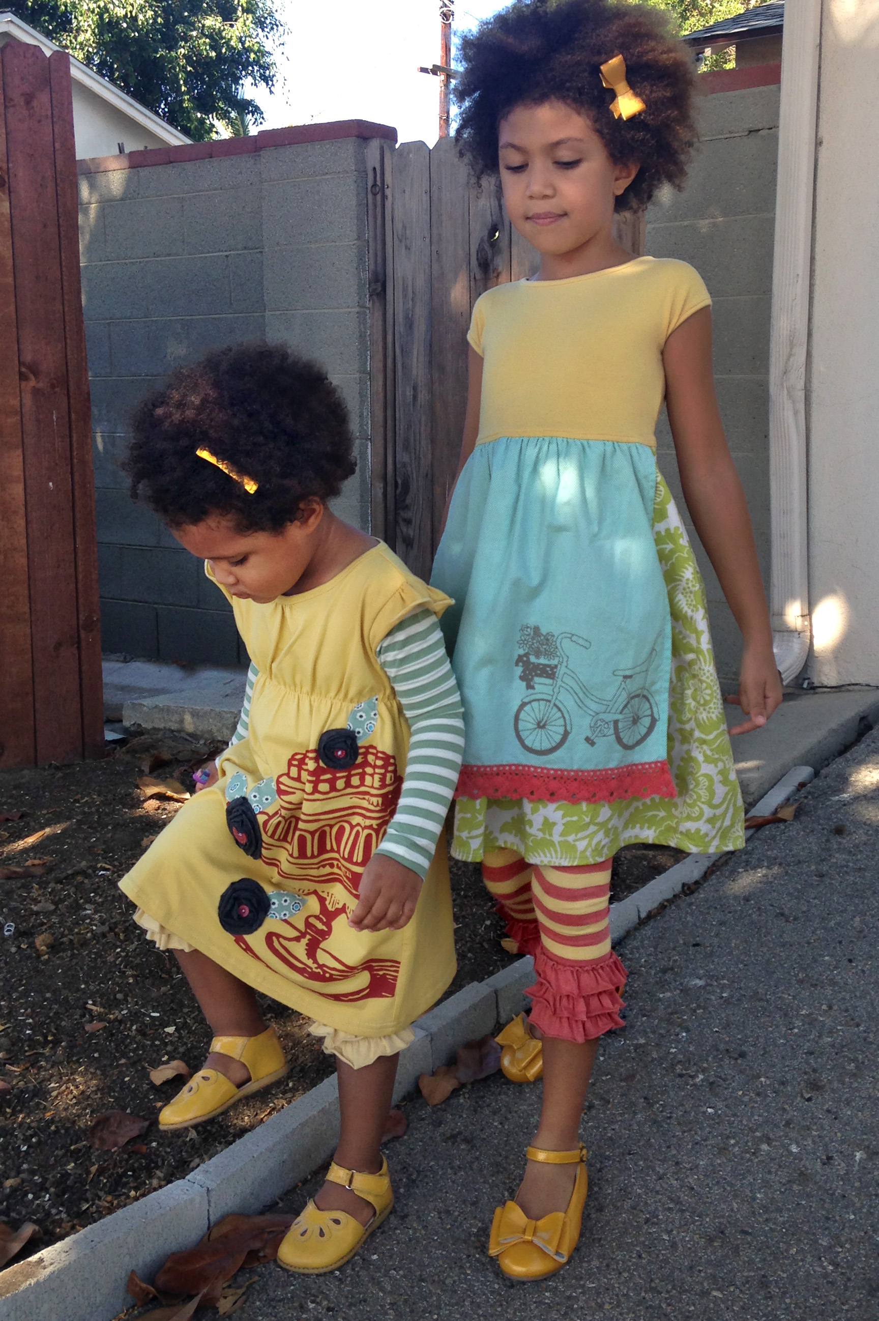 Ellie’s faux-layered cake dress is called Livvy in Cider and it’s by Magpie & Mabel. She’s wearing it with Persnickety triple ruffle yellow leggings and Livie and Luca Petal shoes. Alice is wearing Persnickety Mya Bicycle apron dress with Matilda Jane Goldenrod leggings. Her yellow patent shoes with bows are Joyfolie Loralie.