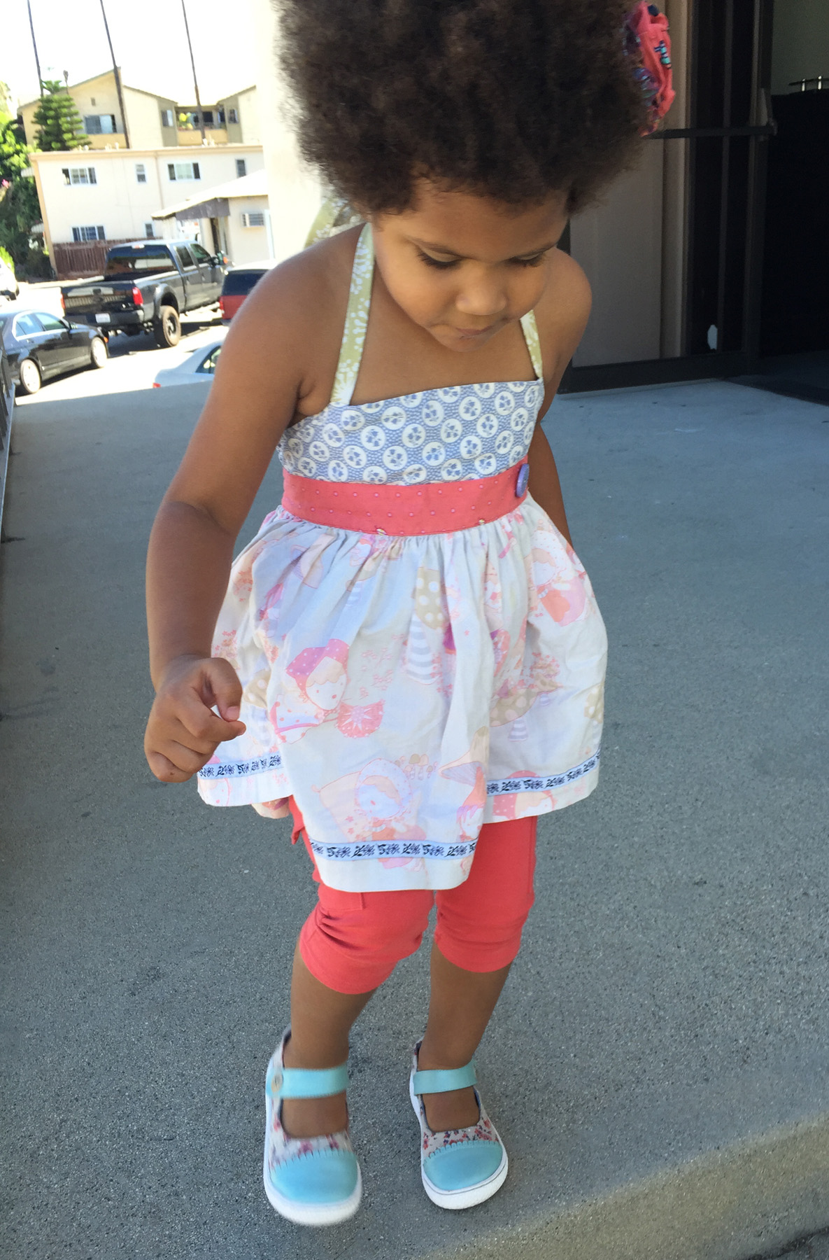 Matilda Jane Platinum Santa Monica Ellie dress on Alice. Matilda Jane All A Flutter Peasant Top and Candied Delight capri leggings on Ellie. Joyfolie Naomi T-strap sandals and PePe Green Laced sandals for shoes.