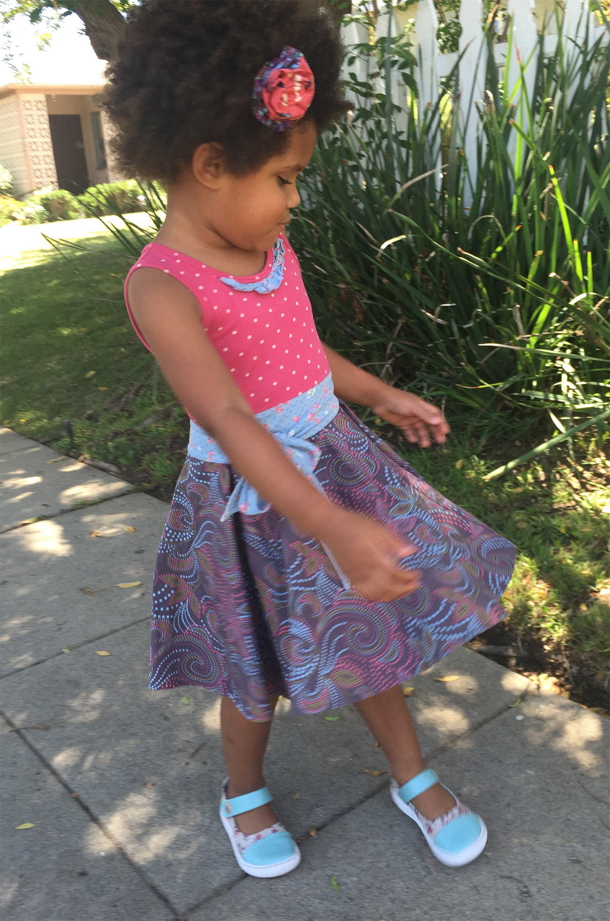 I didn’t think much of this dress until Ellie put it on – it sits so perfectly cute and is so twirly! It’s from Matilda Jane Platinum collection and is called Sprinkles tank dress. Love the details, like the little ruche at the collar line and the sash that can be tied in front, back, or the side like we did. Ellie’s shoes are Livie and Luca Skipper in Cornflower.