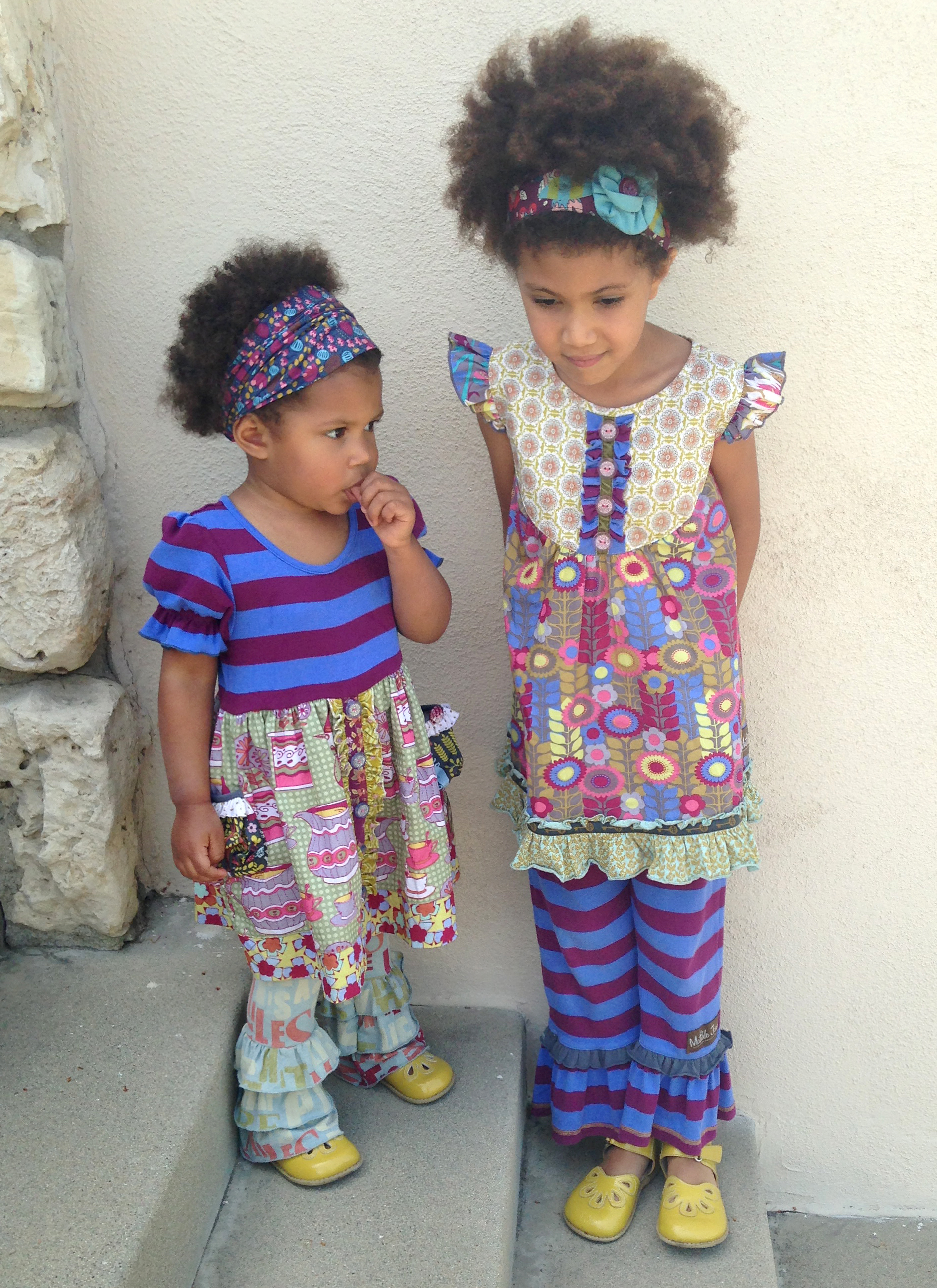 I love these vibrant stripes in combination with very saddle, almost neutral colors. Both Matilda Jane dresses, Maggie at Tea on Ellie and Chasing Daisy on Alice, plus Alice’s Royal Big Ruffles, are all from Heart Soul Pride / Character Counts collection. Ellie’s Road Trip Bennys leggings are from Matilda Jane Platinum. Girls’ headbands are from Paint by Numbers collection – Splatter headband and Nancy in Burgundy. Yellow Livie and Luca Petal shoes for both.
