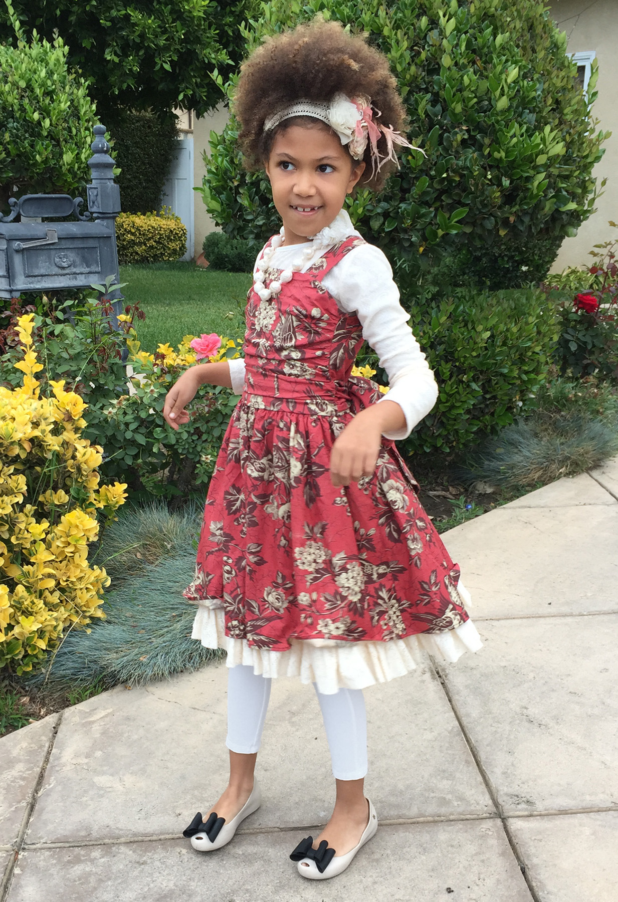 For her waltz dance at school’s end-of-the-year Spring Fling Alice chose to wear Persnickety Corset dress from their Holiday collection. She’s wearing it over Lace Overlay tee, also by Persnickety, and Gap basic leggings. Her shoes are Ultragirl Sweet IX flats by Melissa. She’s accessorized with Persnickety Lace necklace and Creamsicle headband.