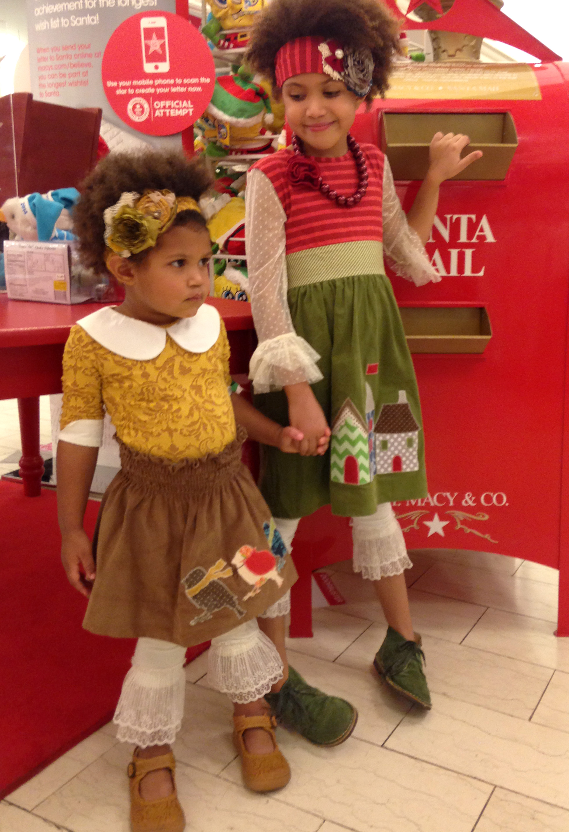 This Saturday my girls went to drop off their Santa Mail and take pictures with Santa Claus in their Persnickety outfits. Ellie is wearing Gold Laylah top with white collar, Camel Lovey skirt with winter birds applique, Ruffle Lace leggings in cream, and Goldielocks headband. Livie and Luca Clove shoes in embossed yellow leather. Alice is wearing Ginger dress with gingerbread houses applique, same Ruffle Lace leggings in cream, Holiday red necklace, and Peppermint headband. Her green suede boots are by Naturino. All the pieces in these outfits are from Fall 2013 Golden Girl and Holiday collections by Persnickety.