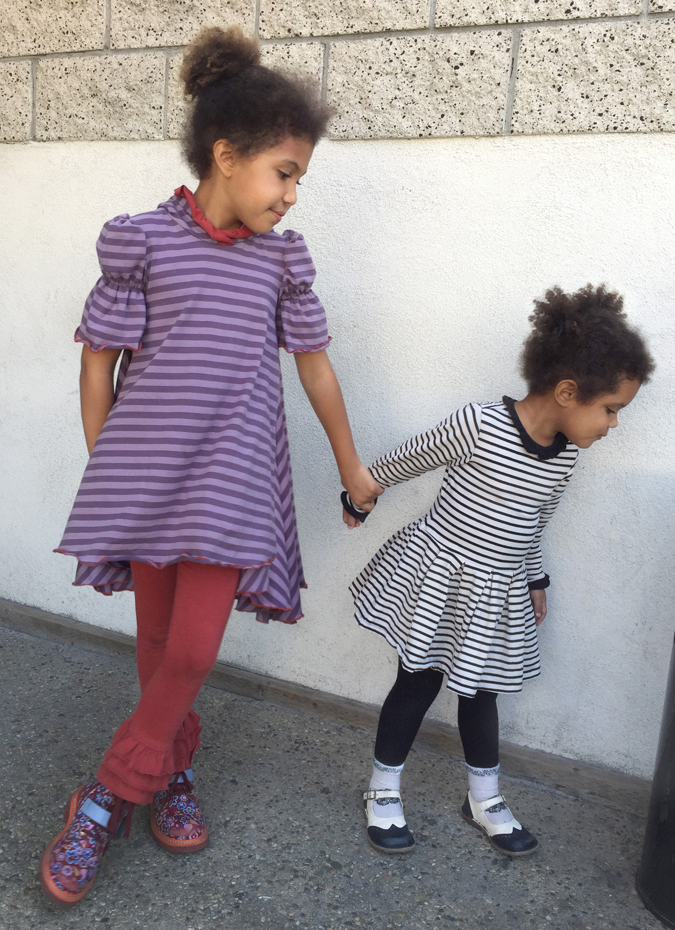Girls’ hair looks so messy by the end of the day… Alice is wearing Persnickety set of Eggplant Trapeze Hooded tunic in purple stripe and Triple Ruffle leggings in Cranberry, both from Fall 2011 collection. Her boots are Flower Power by Oilily. Ellie is wearing Onekid black and white striped dress with Eliane et Lena Edwina tights. Her shoes are perforated Spectator Mary Janes by PePe.