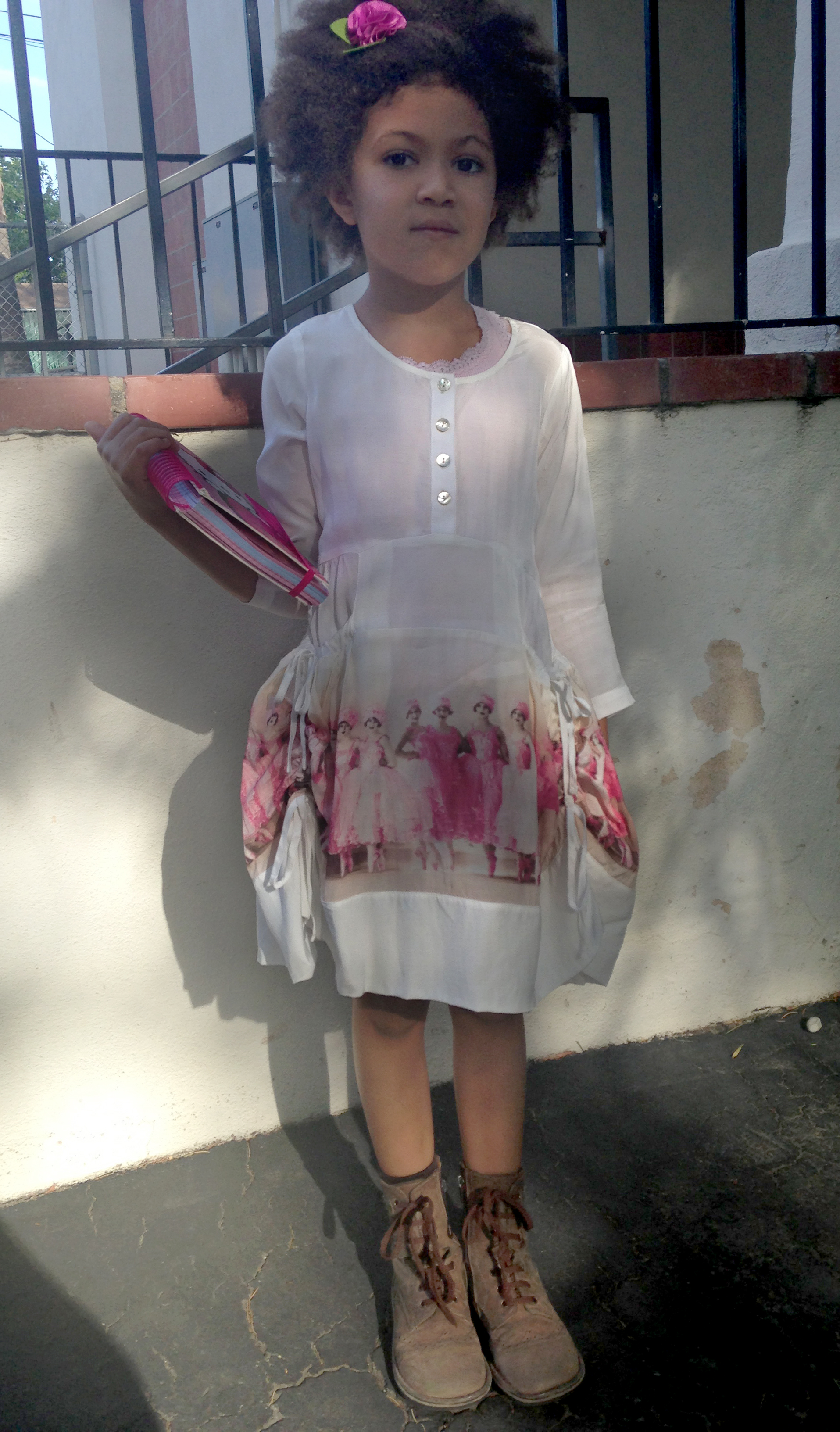 This Paper Wings Drawstring Pink Ballerinas dress is beautiful. It’s a little bit sheer, and Alice is wearing a tank top with shorts underneath. PePe Prairie boots. Joyfolie hair clip.