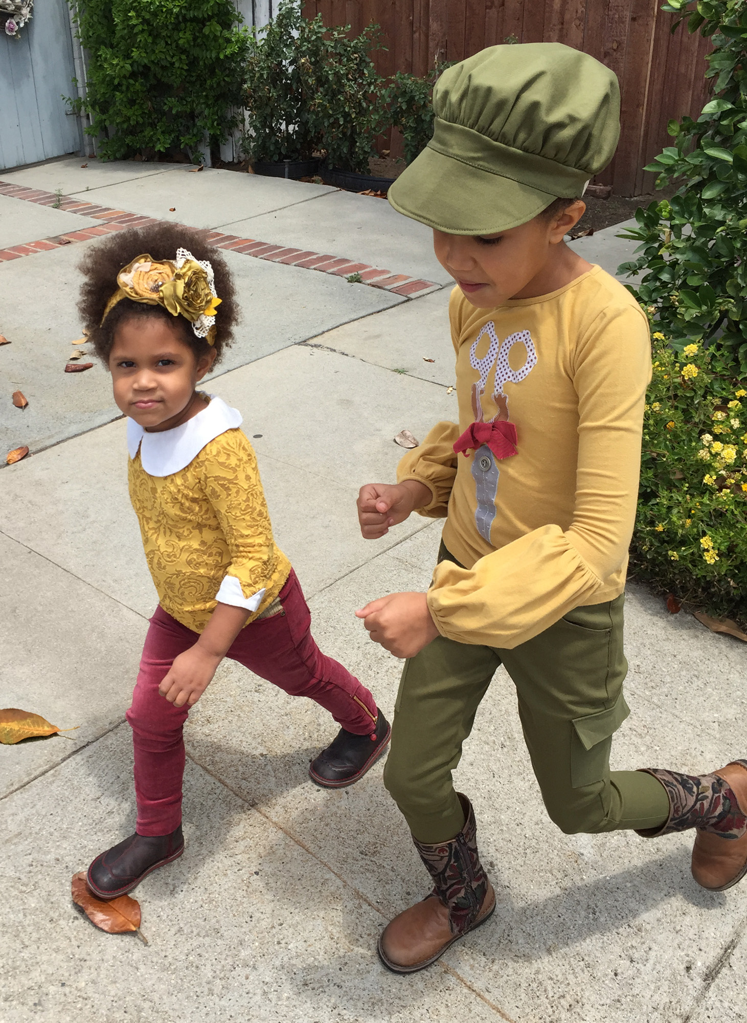 5:16:15_IMG_6496Ellie is wearing Jak & Peppar Follow Your Heart dress in Red Railroad with Persnickety Brown Button Tab leggings, Matilda Jane Splatter headband, and Old Navy Velvet Fox flats. Alice’s outfits is: Persnickety Clara Estelle peplum top in plaid, Jak & Peppar Basic Olive leggings, and Heartfelt Hoodie in Burnt Red Motif. Brocade Maisole PePe boots in Taupe complete her outfit.