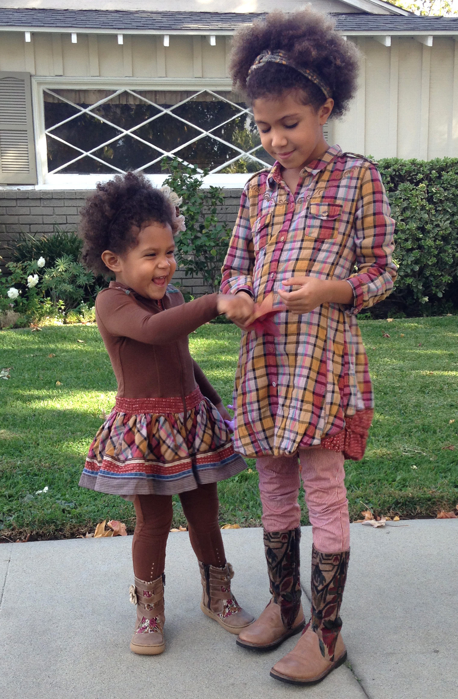 Beautiful burnt fall colors, perfect for Thanksgiving! Little Ellie is wearing Eliane et Lena outfit of Hana dress and Alice leggings in curry brown from Rock and Folk collection. Alice’s plaid shirt-dress is called Sindy and is by the same brand, from the same Rock and Folk collection. Her pants are Jak Painter Skinnies in red pinstripe by Jak & Peppar. Boots are Livie and Luca Stitchers in Vintage Brown on Ellie, and PePe Brocade Maisole in Taupe on Alice. Girls are accessorized with headbands – Persnickety Brownie Pie hard headband on Ellie and Jak & Peppar Stevie headband on Alice.