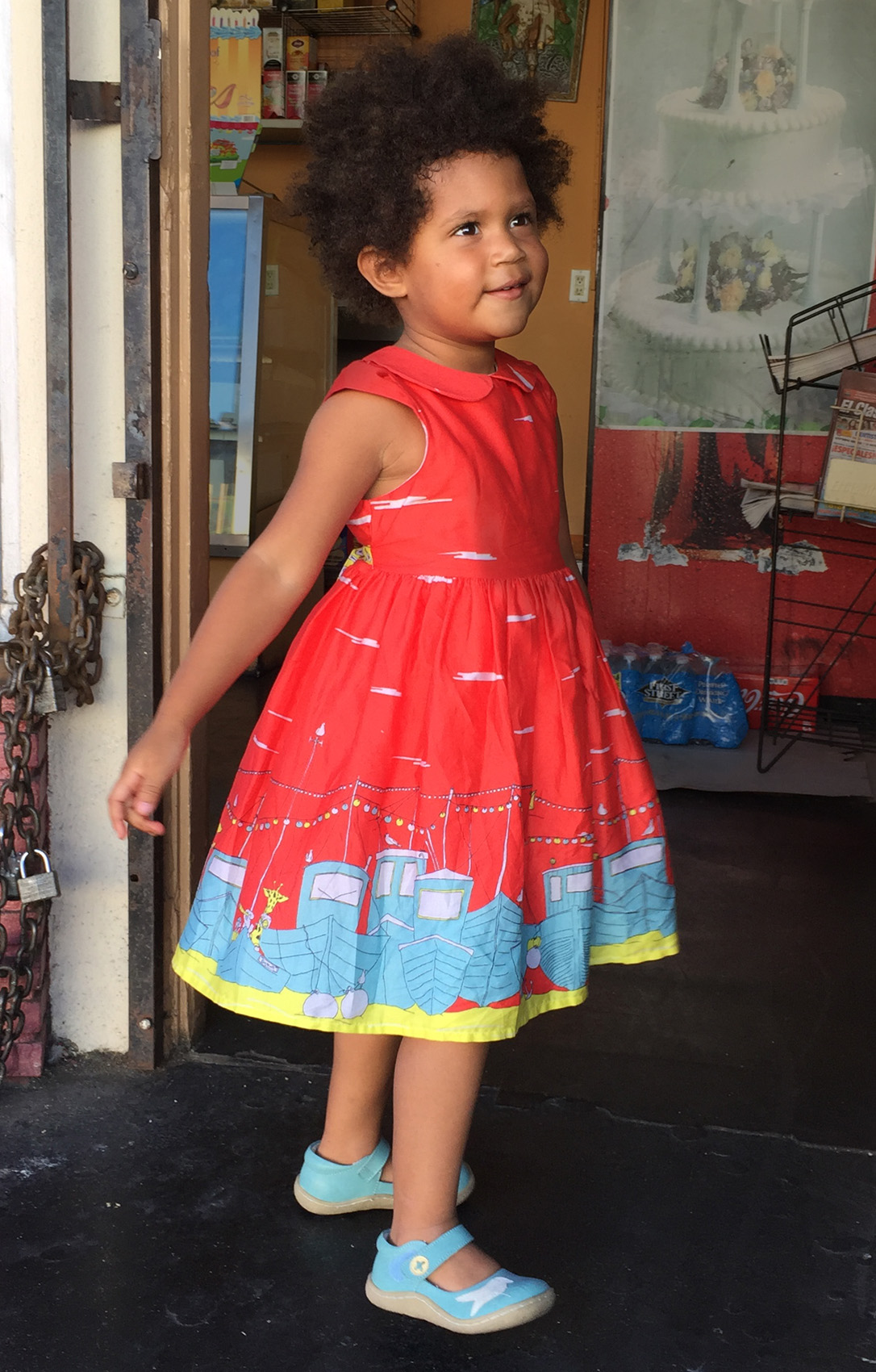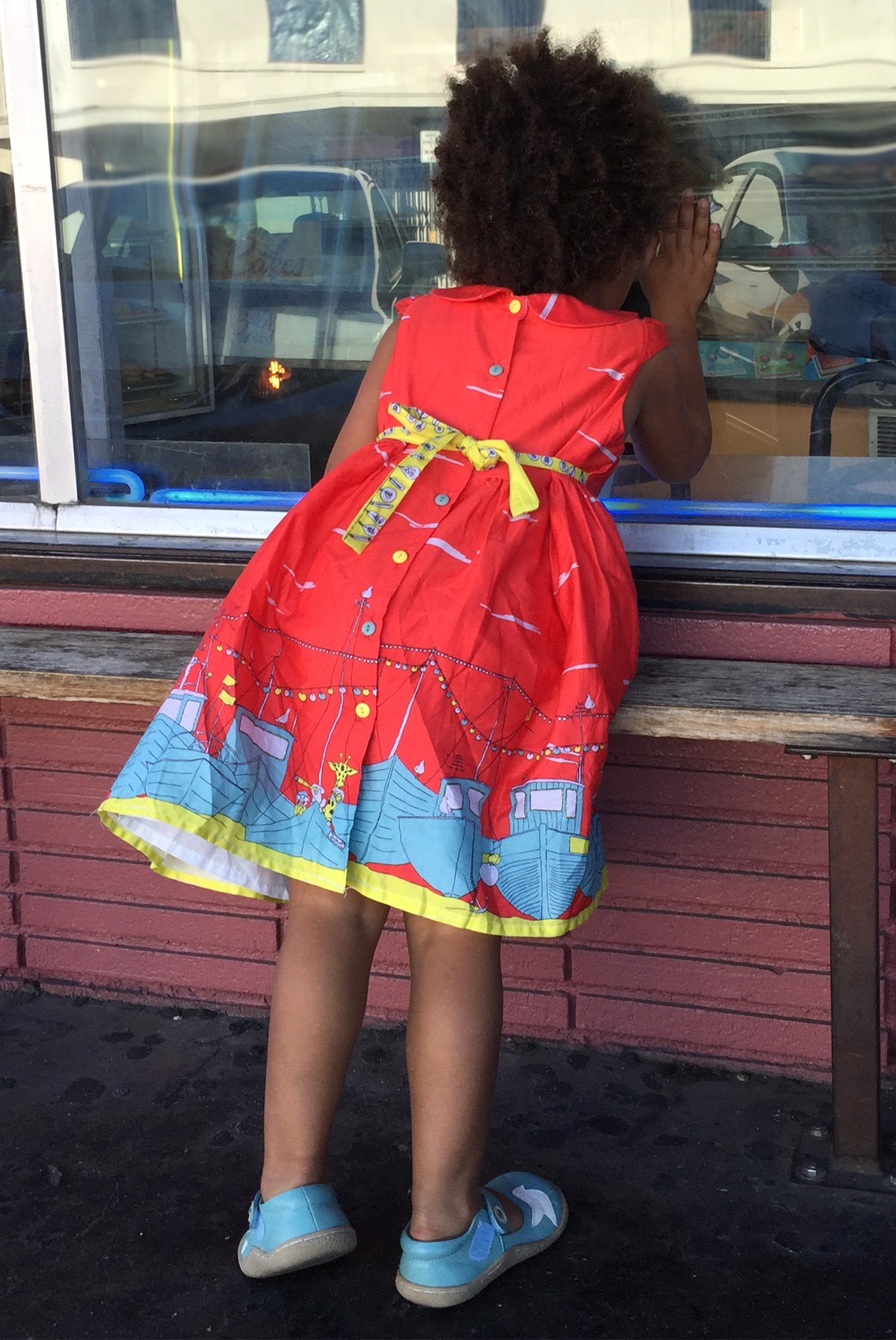 Poppy Millie Boats dress in red and Livie and Luca Pio Pio shoes in Light Blue. I’m finding these Pio Pio’s matching half of our wardrobe and loving them more and more. Notice the buttons on the back of the dress – yellows and blues playfully taking turns – love this brand!