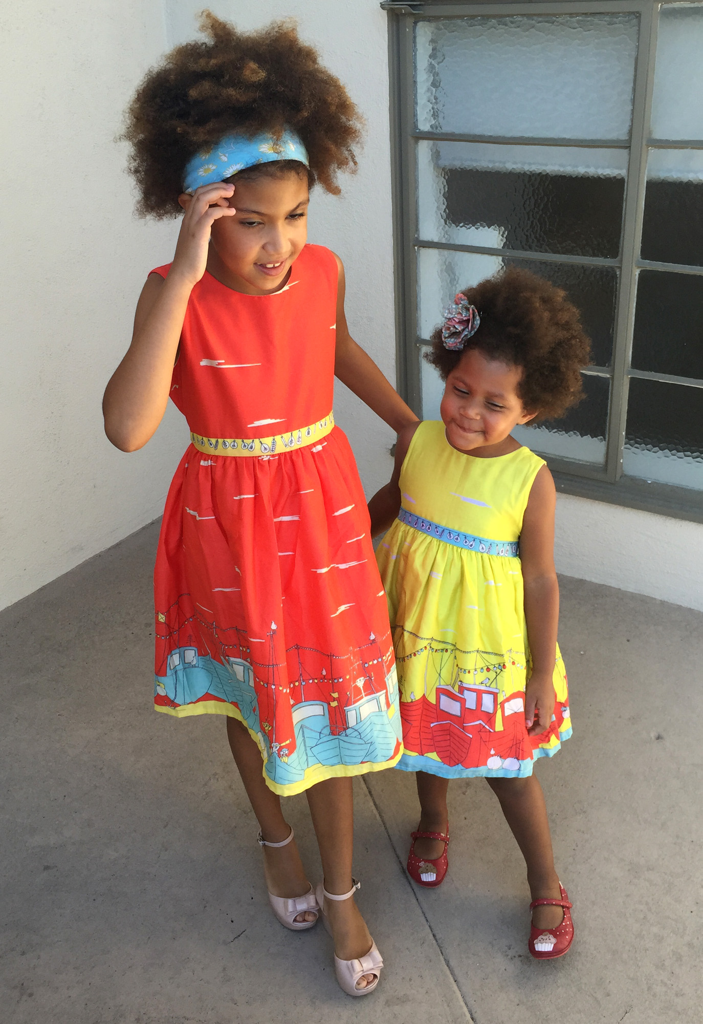 Beautiful, very colorful, cheerful, and full of sunshine dresses by Poppy of England. It’s the same Martha style dress in Boats print on both girls, just different color. Girls love reading stories that come with every dress. So much fun with every order from this awesome British brand!