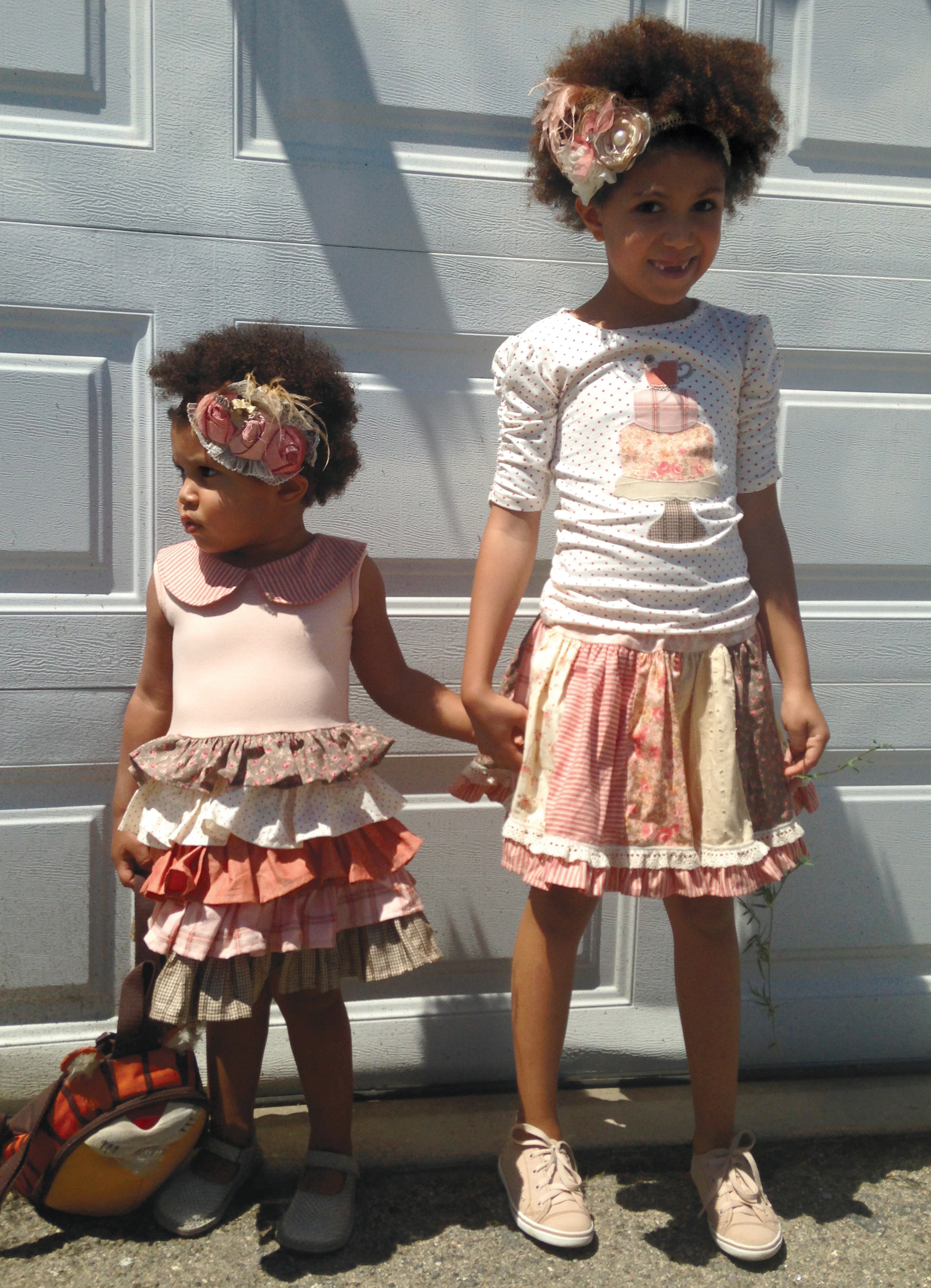 I love soft powder pink colors of the Apple Blossom collection by Persnickety. Macie Jane dress for Ellie with Sarah Jane headband (this one is from an older collection and it’s pink is on a colder side of the spectrum). Her shoes are PePe Mary Janes in Star Print, and she’s dragging along her Sammies Tiger backpack by Samsonite. Alice is dressed in Fannie Cake Applique top, Paige skirt, and Creamsicle headband. Shoes are from Zara.