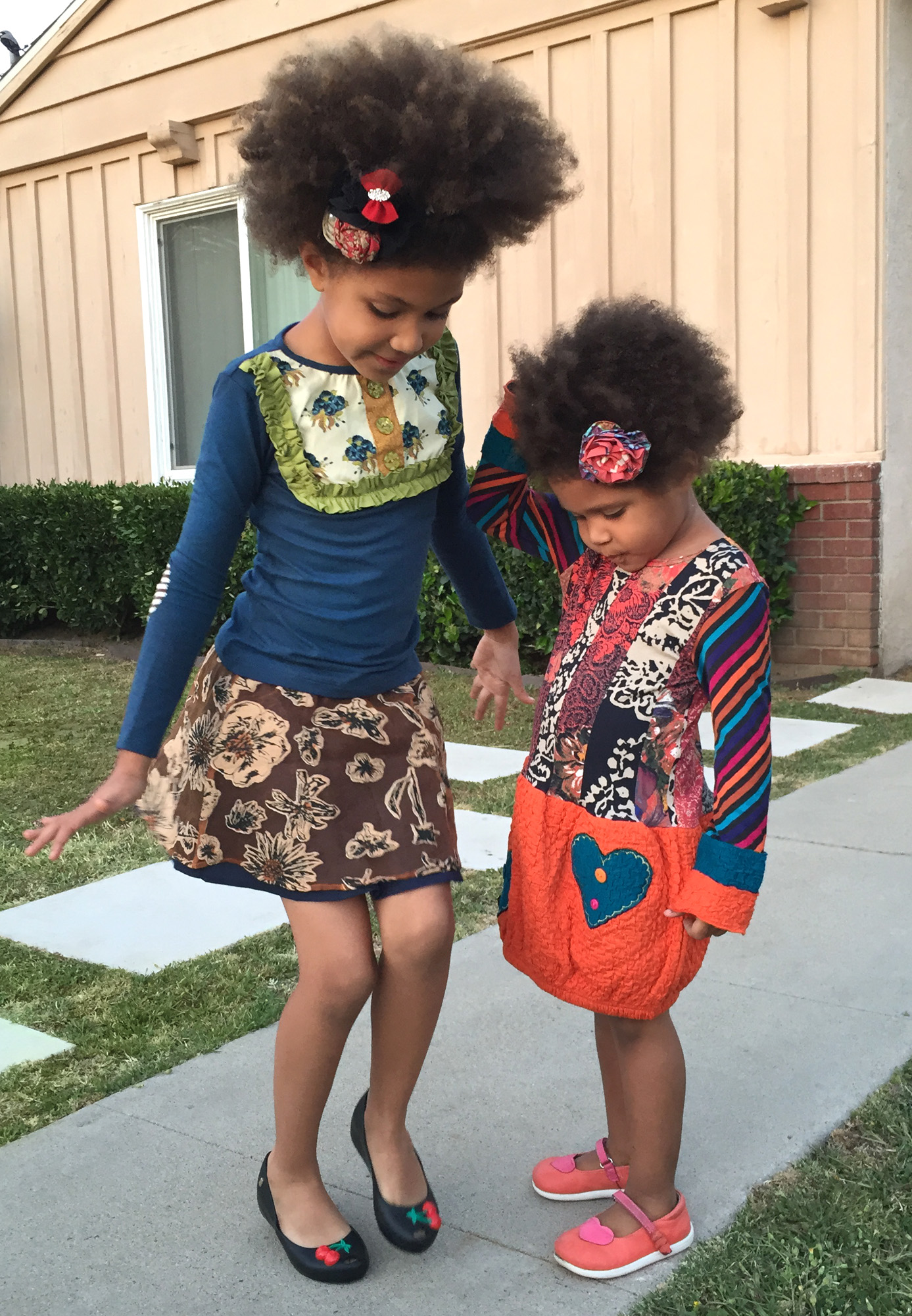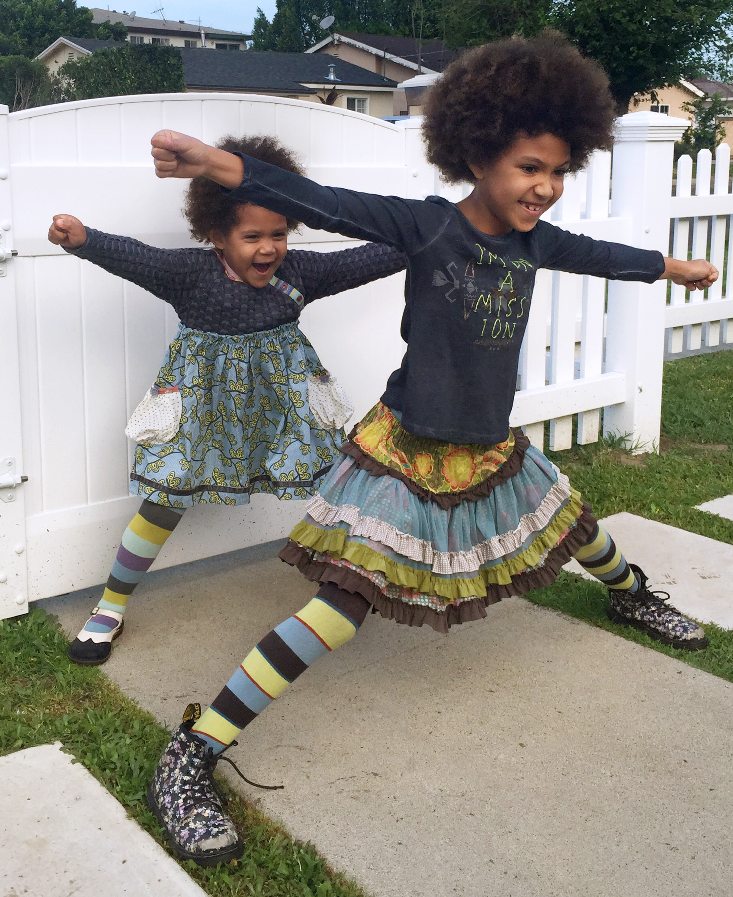 Little Ellie is wearing Matilda Jane Monroe dress and Reggie tights, both from Character Counts collection of 2012. I love the super long tail on the hood of this dress! Alice has on a Scotch R’Belle tee with embroidered “I’m on a mission” slogan. The Ava skirt is from Matilda Jane‘s You & Me collection of 2011, and Mulligan tights are from Field Trip collection of 2010. PePe perforated Spectators on Ellie, and Dr. Martens Brooklee boots on Alice.