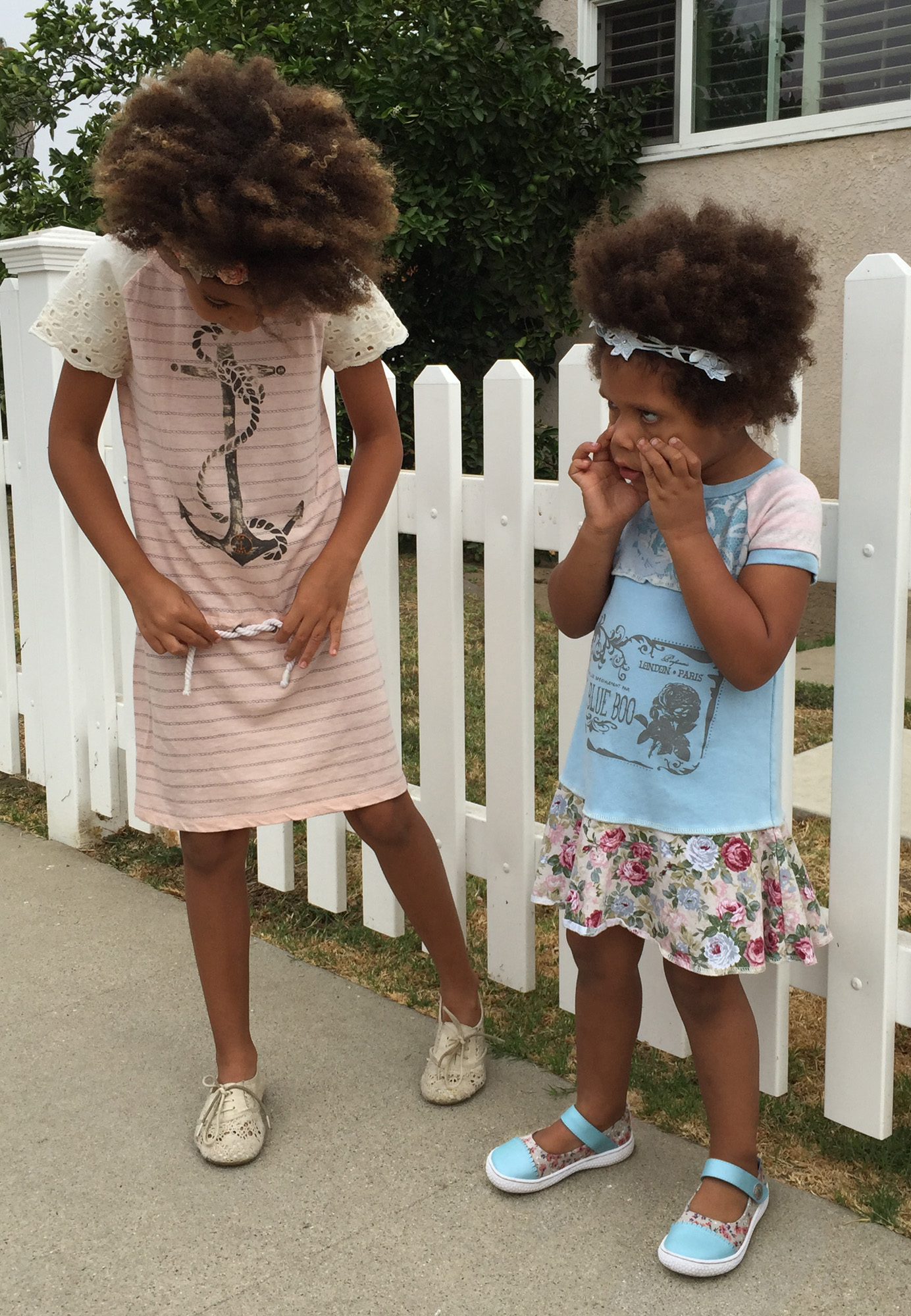 Mademoiselle Scotch R’Belle Anchor Summer dress and Unionbay textile shoes – on Alice. Lil Blue Boo Upcycled floral dress and Livie and Luca Skipper shoes in Cornflower – on Ellie. Headbands are by Persnickety: Goldielocks headband is from Apple Blossom collection and Fairy Dust headband is from Sail Away collection.