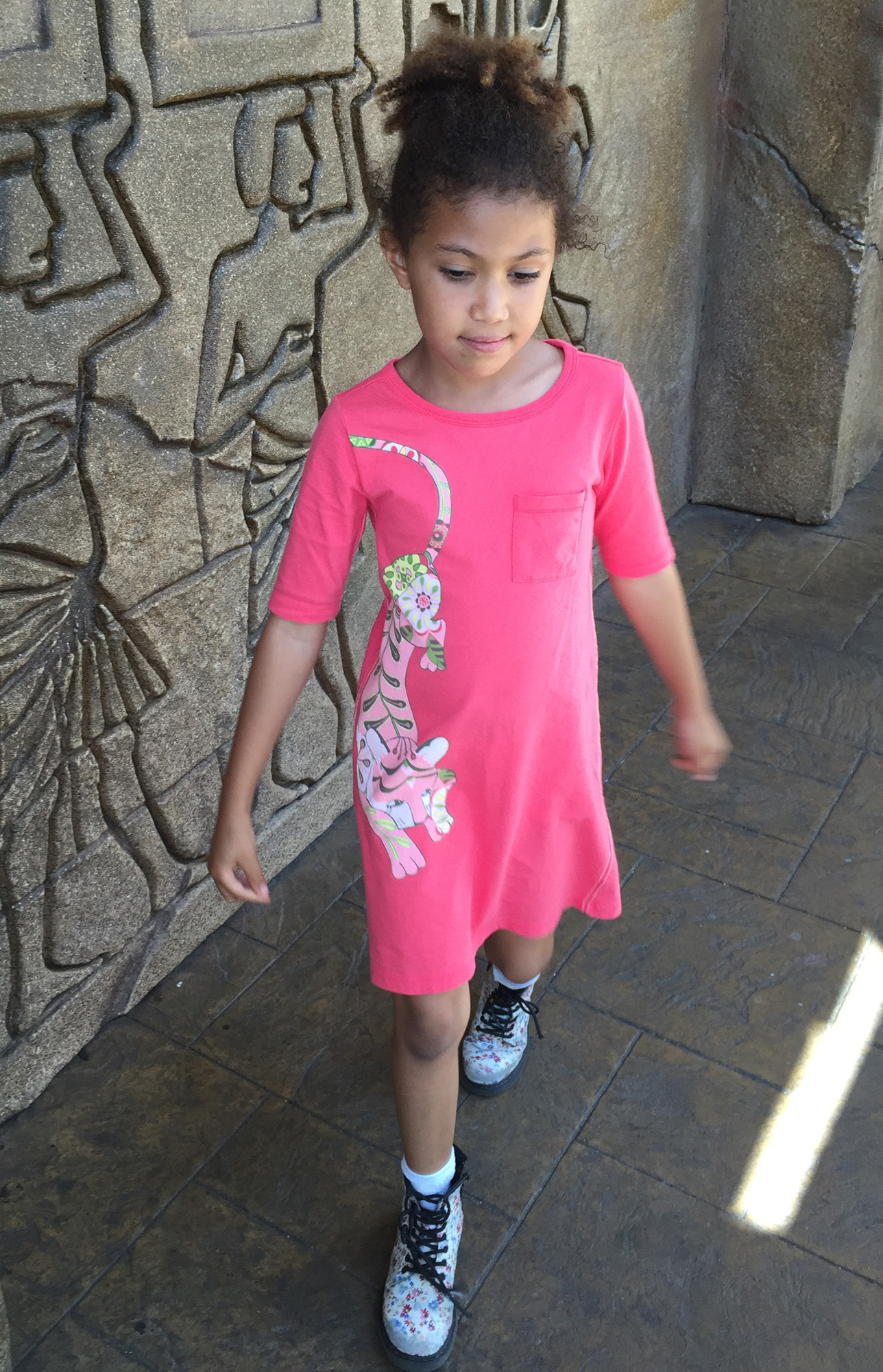 Tea Collection Calico Tiger T-shirt Dress in neon pink from their current, India-inspired collection. Dr. Martens white Delaney boots.