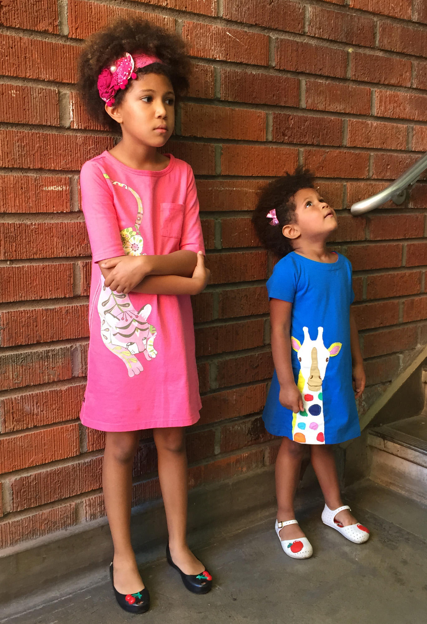 Alice’s neon pink Calico Tiger T-shirt dress by Tea Collection is a beautiful match for Ellie’s blue Mini Boden Tropical Riviera Giraffe Appliqué dress. Alice’s magenta Rose Bouquet headband is by Persnickety. Melissa Ultragirl X cherry jelly shoes in black on Alice, and perforated Mini Melissa Furadinha apple in white on Ellie.