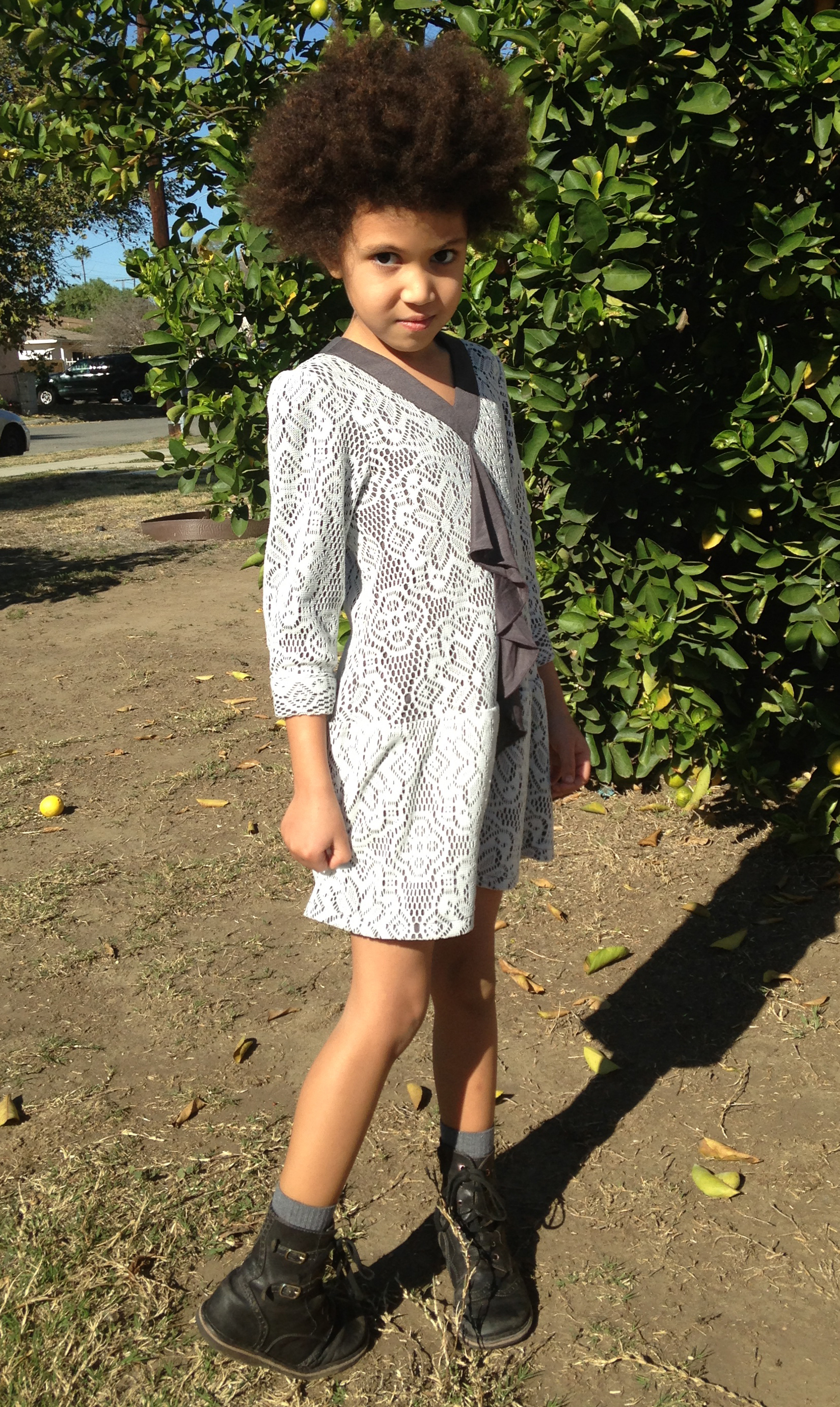 Both girls are wearing Grey and Dusty Rose Trish Scully lace wool-blend dresses from Heirloom collection. Ellie wore this same dress a year ago, when it was a little big on her. I think now it looks just right. Alice overgrew hers a little, so I added Persnickety pettiskirt, but now think it wasn’t necessary. Persnickety leggings on both, Alice’s are White Lace, and Ellie’s are Basic in Creme. Joyfolie green Piper flats on Alice and white lace Ellie shoes on Ellie. Chenille brocade coats are by A.Bird brand: the longer one with belt (on Alice) is called Blake coat, and the tiered one with side closure (on Ellie) is Kalan. I like how the lining of Ellie’s coat matches the green of Alice’s shoes.