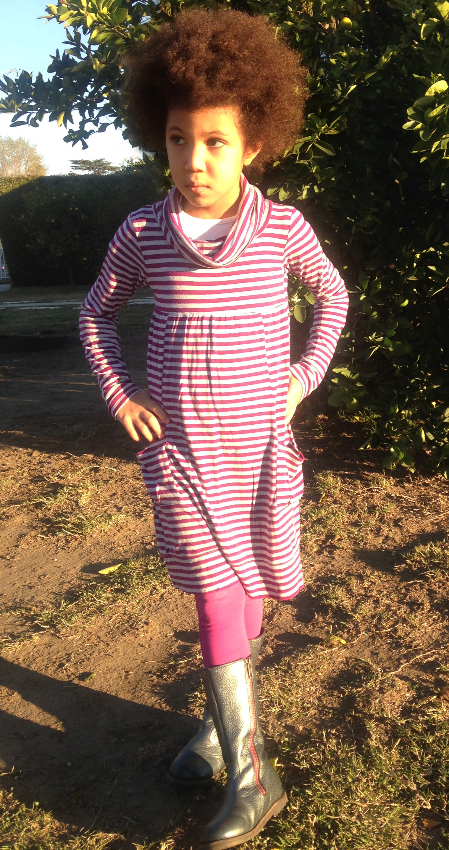 I love the simplicity of this yet stylish outfit. United Colors of Benetton dress over Naartjie magenta leggings. Mini Boden Tall Leather boots in Pewter Metallic.