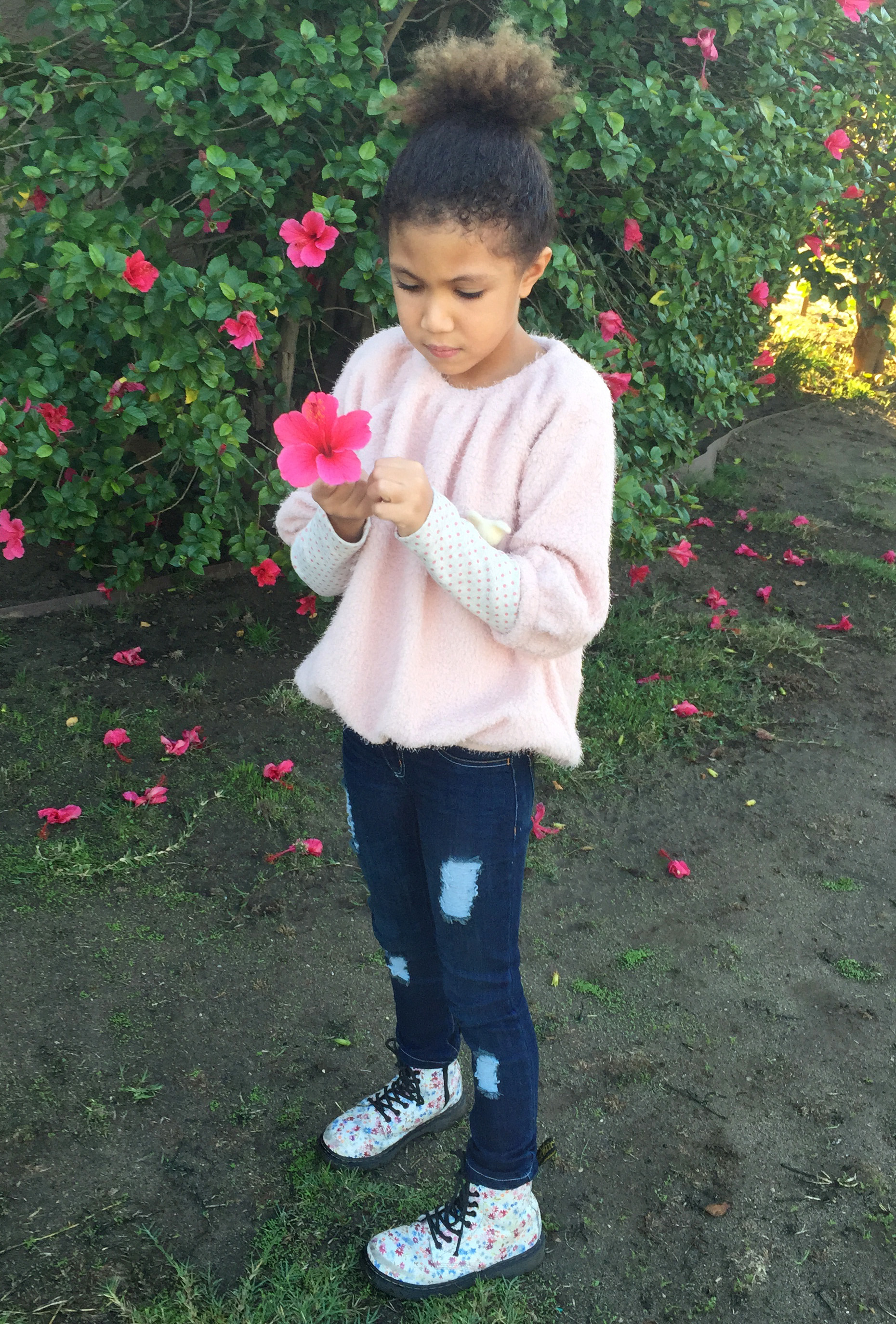 It’s a little too early and a little too gloomy, and Ellie feels a little too somber… but ready to go and line up all the kids in her childcare :)) I absolutely adore this Annika Gellete jacket with detachable gold cat from Wunway. I was keeping an eye on it for a pretty long time waiting when it will go on sale and finally it’s discounted! Wunway sizes run much smaller though. Ellie is only two and a half… well, she’s very tall 2 1/2 year old and wears size 3T, (and already switched to size 4 in Matilda Jane clothing!). Knowing from the past orders that I need to size up significantly I ordered size M (4, 5) and it fits perfectly. The Herringbone Riding pants with suede knee patches are from Janie and Jack‘s English Rider collection. PePe Silver Shimmer Leopard boots.